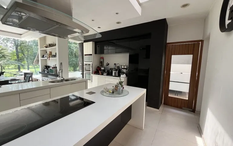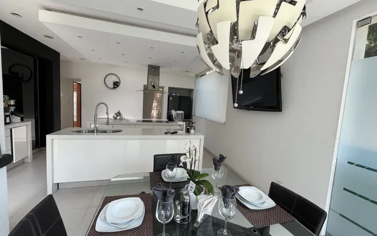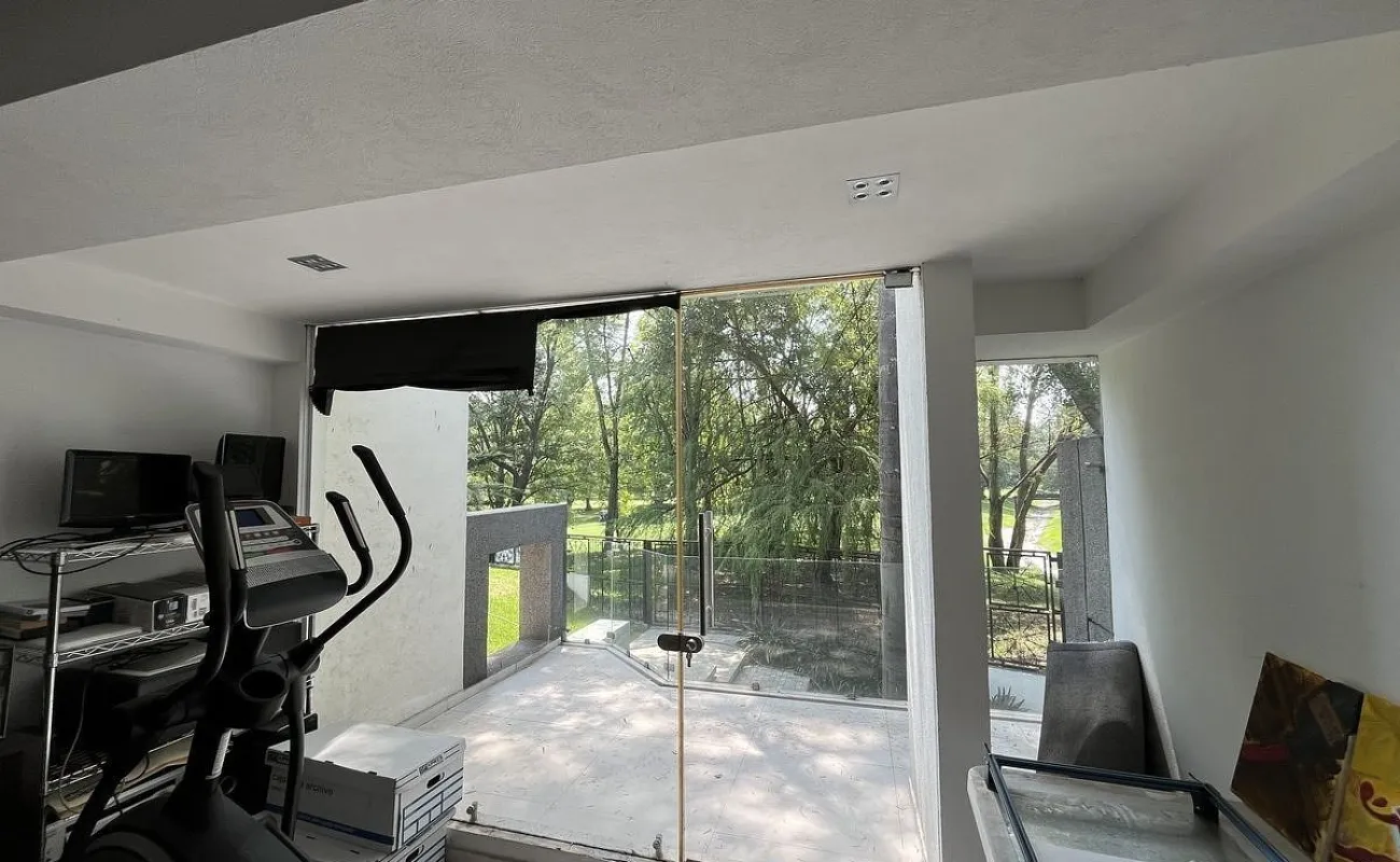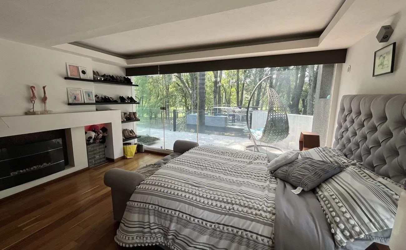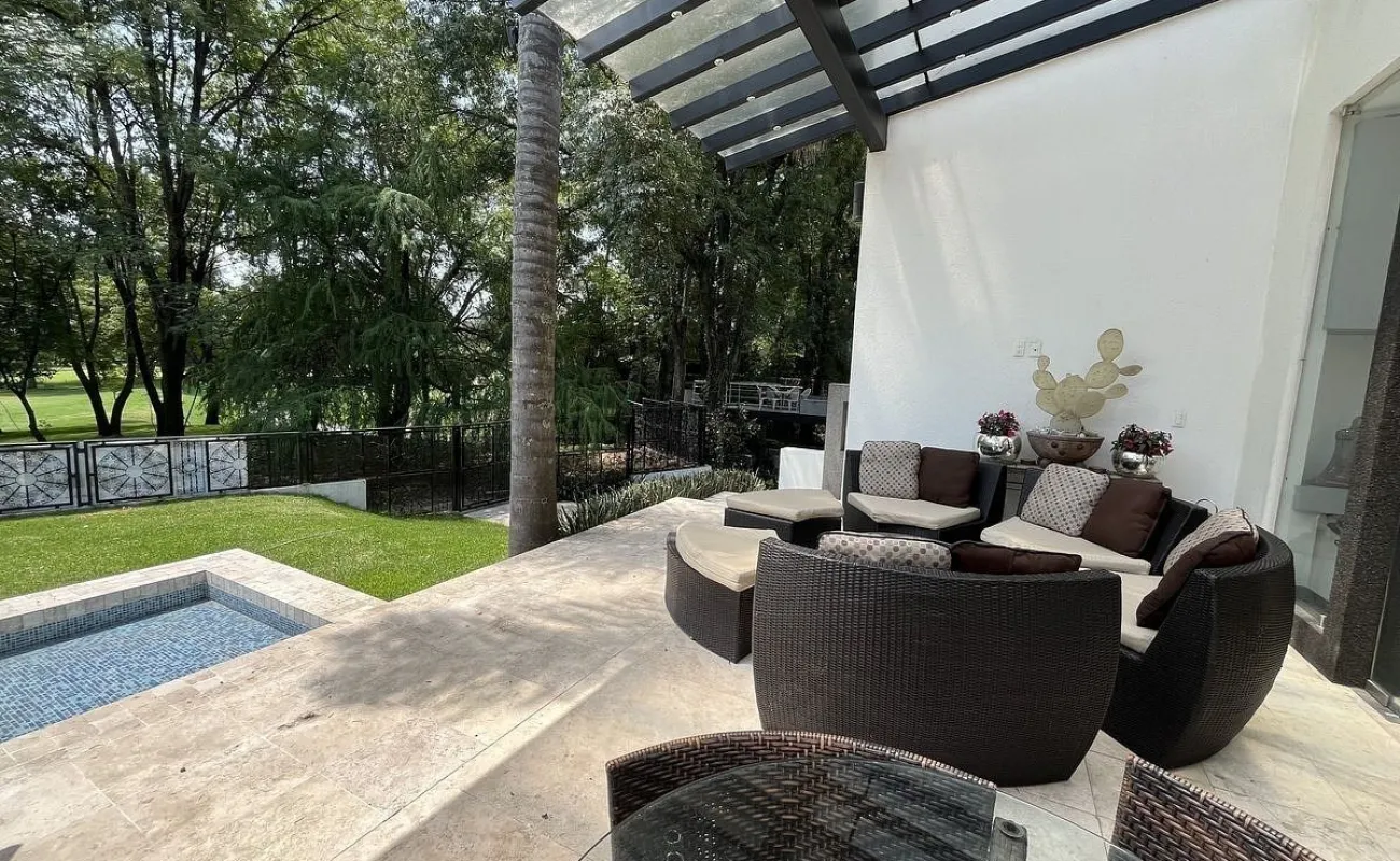 Entrando se encuentra medio baño de visitas, bar , amplísimo espacio para sala y comedor con un hermoso ventanal que da al jardín y al campo de golf, chimenea de etanol y el comedor con techo corredizo para abrir el espacio al aire libre. Linda y equipada cocina moderna, antecomedor y una 2a cocina de apoyo además de enorme despensa. La recámara principal está un piso arriba y cuenta con sala de TV, enorme terraza con gran vista, baño completo y vestidor, todas las persianas de la casa son eléctricas.