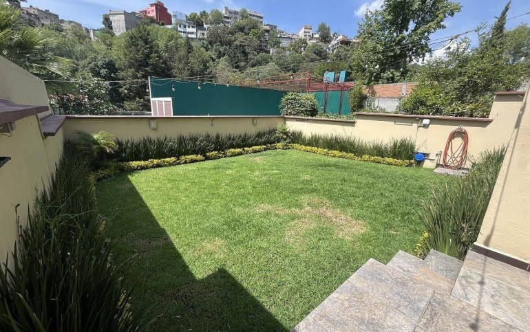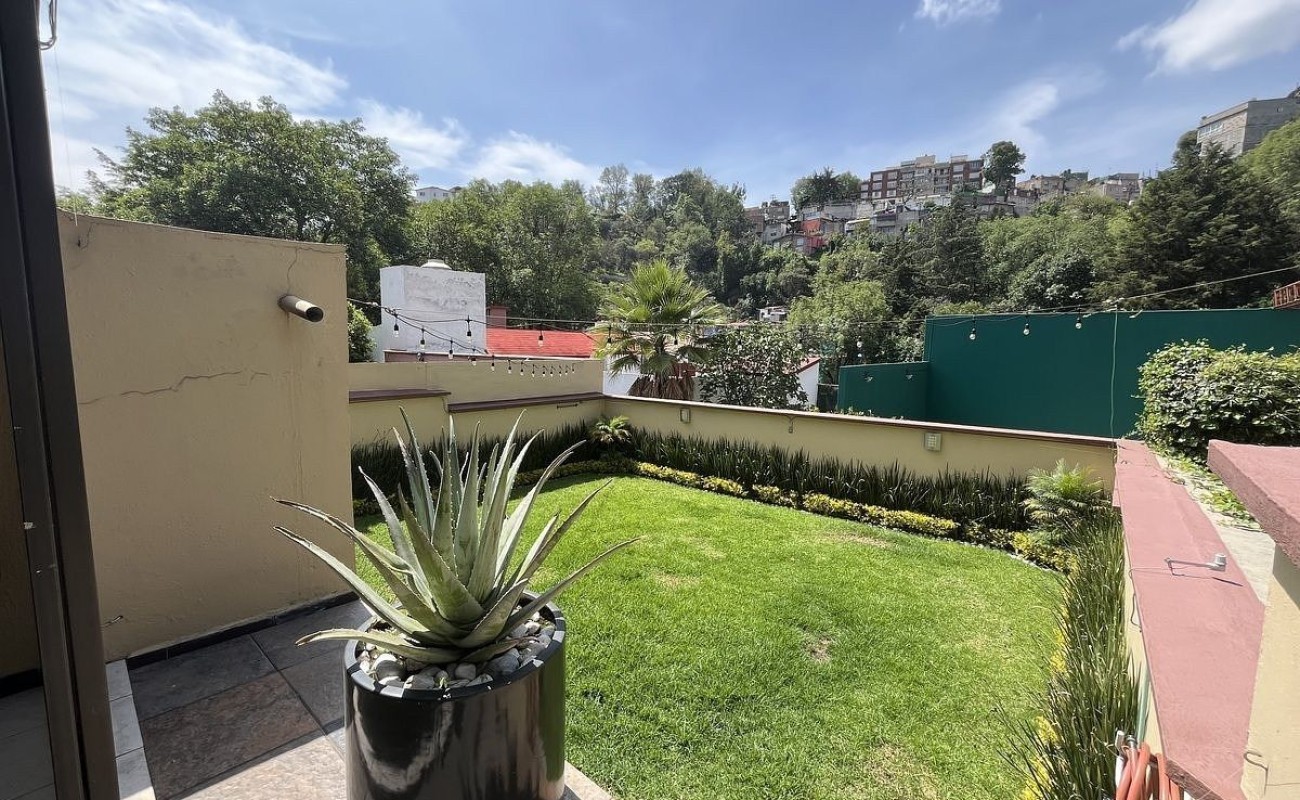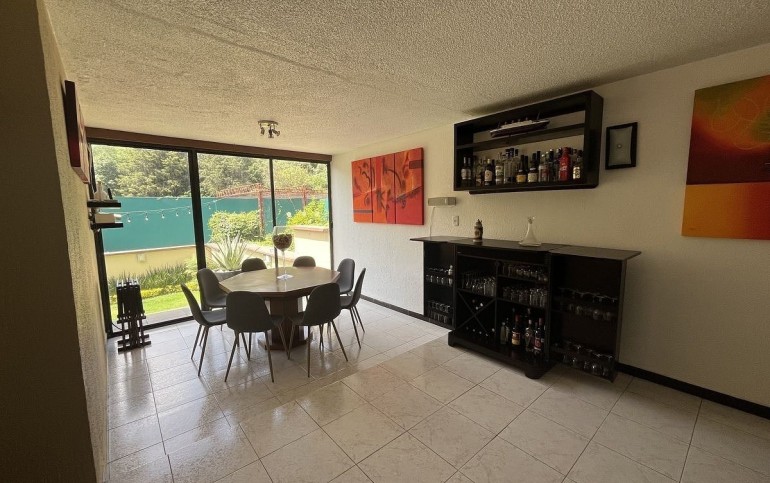 Toda la estancia da a un hermoso jardín plano y verde con sistema de riego con aspersores y de goteo de aproximadamente 90 m2 y una terraza de 20 m2 con vista arbolada. La cocina es hermosa y muy espaciosa con gran alacena y lugares de guardado así como lugar para ante comedor.