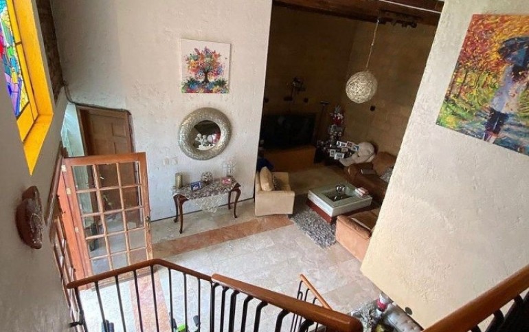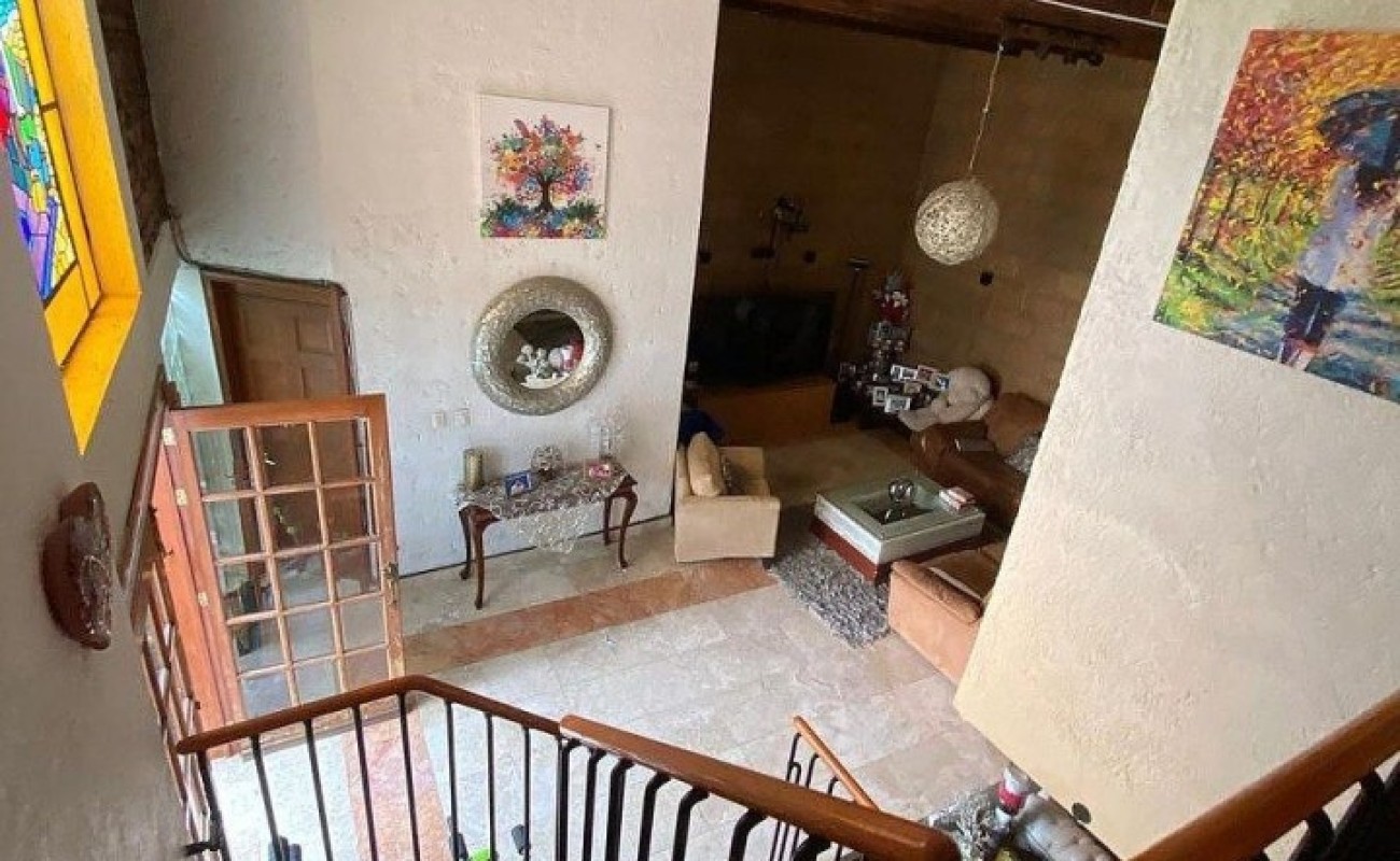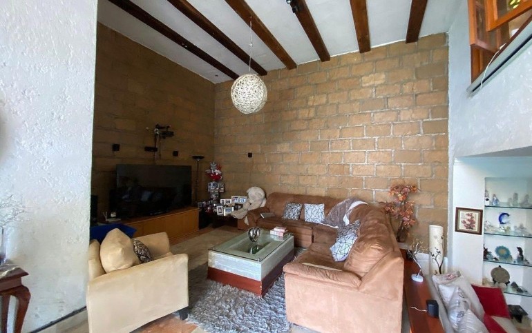 Entrando se encuentra medio baño de visitas, amplia e iluminada estancia para sala, comedor e incluso espacio para sala de TV de doble altura con vigas de madera y piso de mármol travertino.