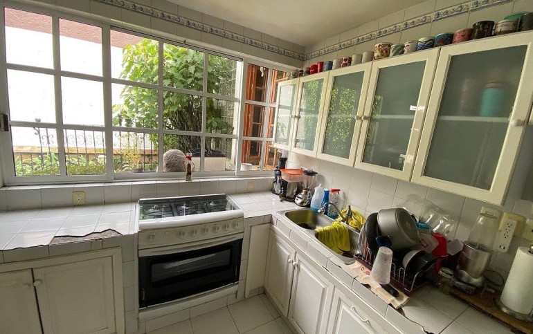 La cocina tiene vista al jardín, es muy iluminada con espacio para antecomedor y cuenta con alacena.