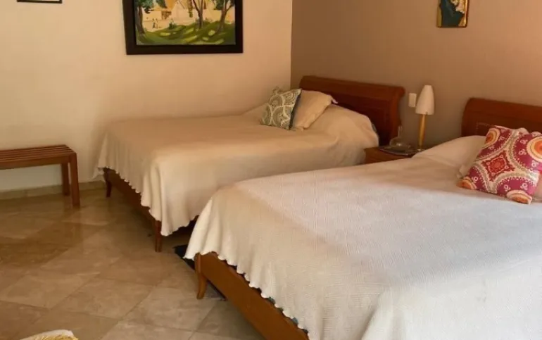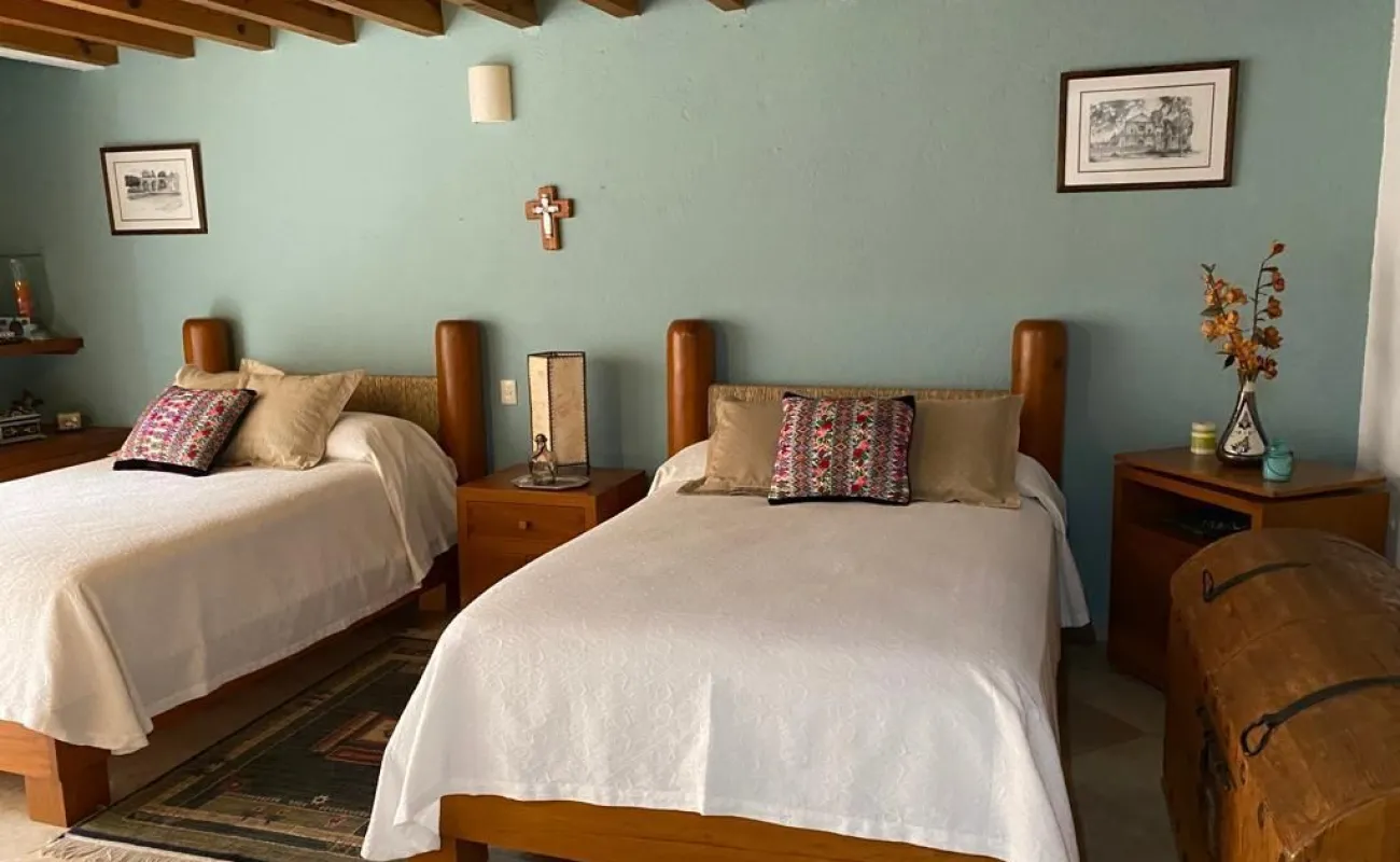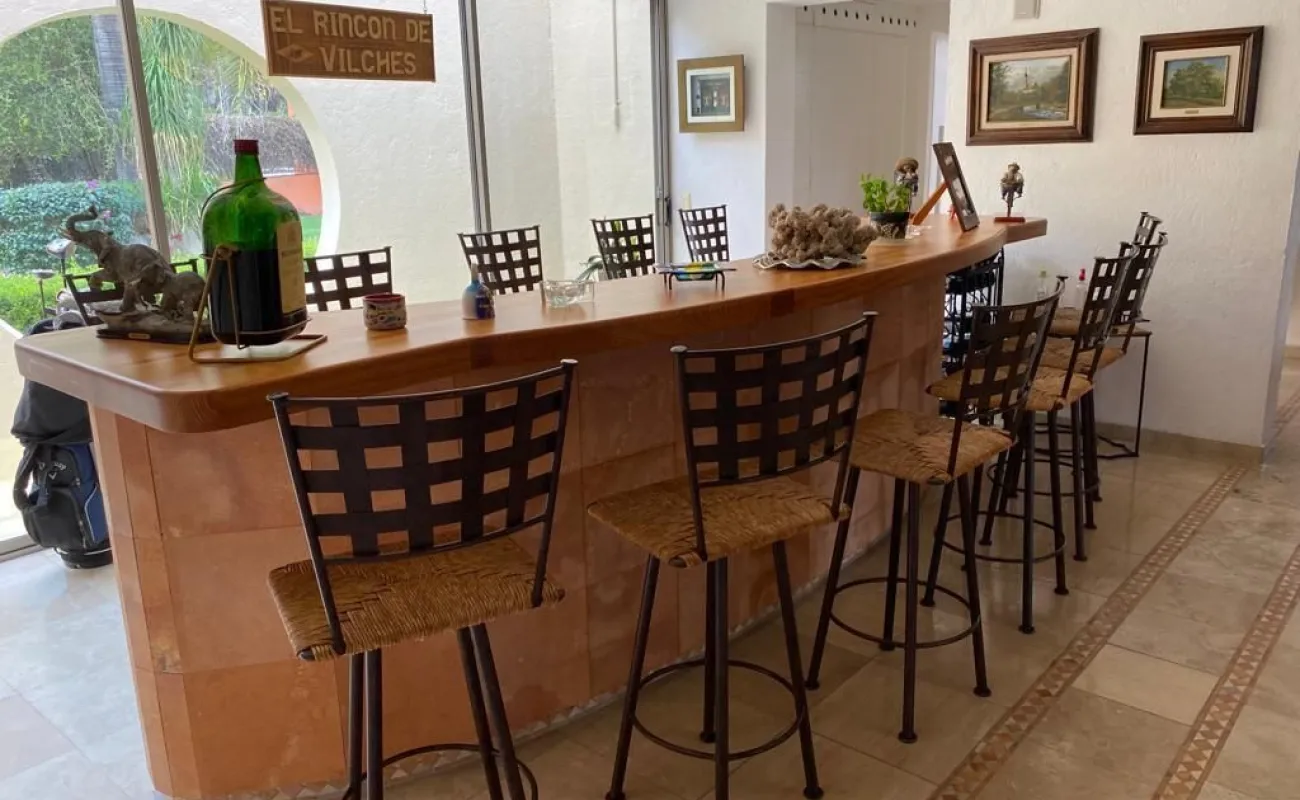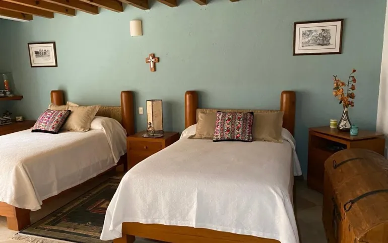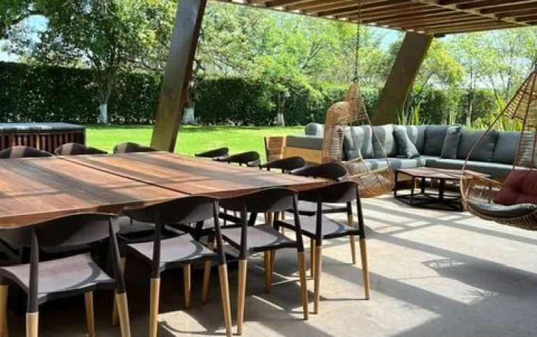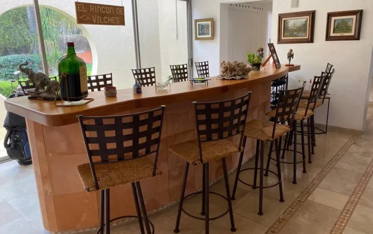 Estancia y comedor con doble altura, bar, cocina, 5 recámaras todas con baño. Espectacular terraza techada con jacuzzi, dos salas y dos comedores exteriores. Alberca techada, terrazas adicionales. Todas las comodidades. Zona de árboles frutales y huerto. Cuarto de servicio, bodegas. Casa de servicio adicional para una familia. Excelente estado de conservación.