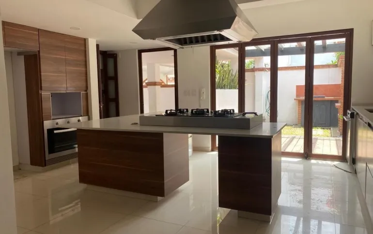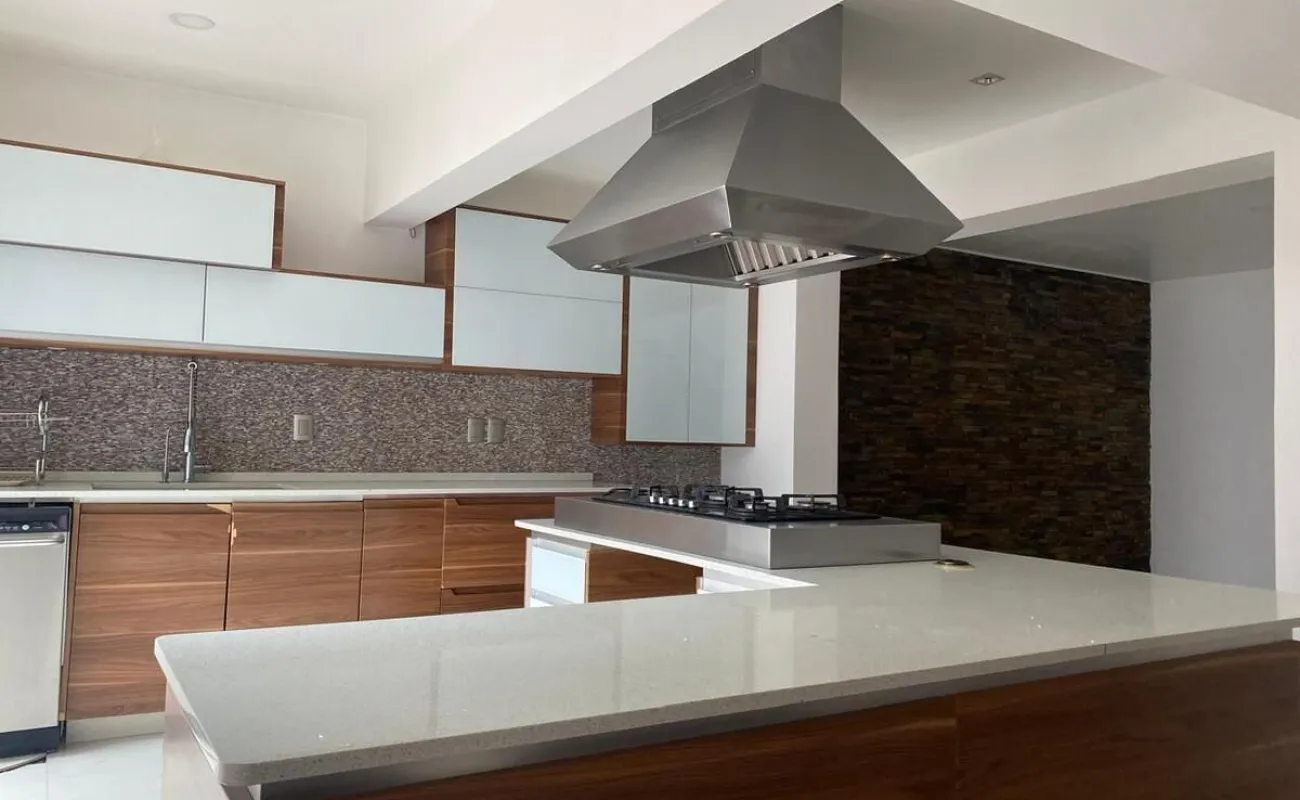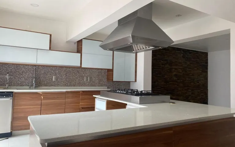 - Cocina equipada con campana de acero inoxidable y barra desayunadora rodeada de amplios anaqueles y modernos acabados