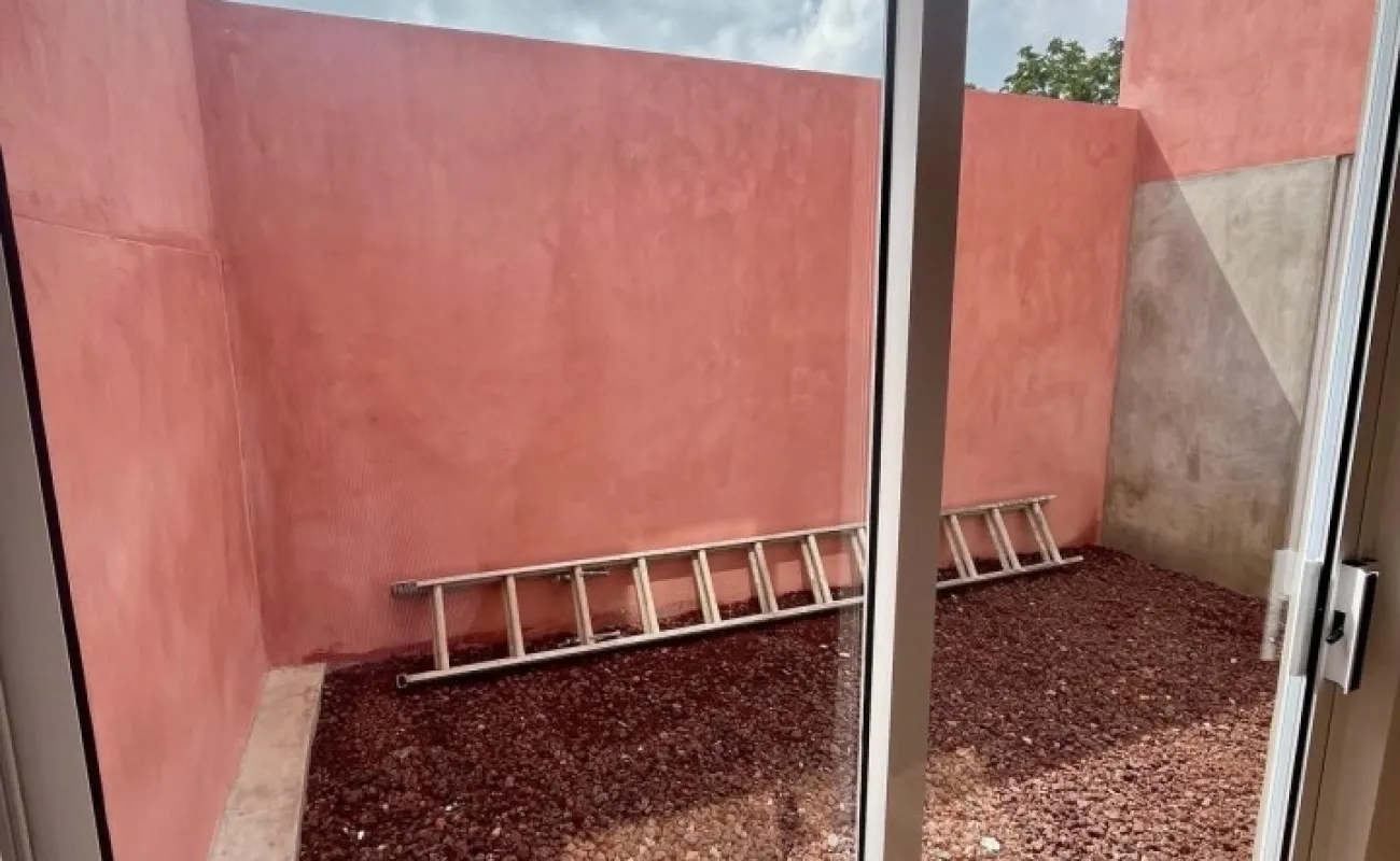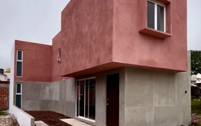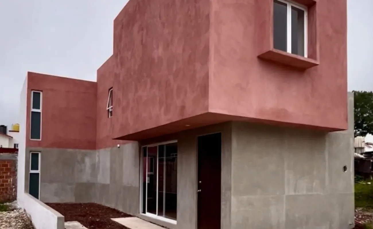 La fachada destaca por su estructura contemporánea con acabados en tonos rosados y grises, ofreciendo un aspecto elegante y distintivo.
