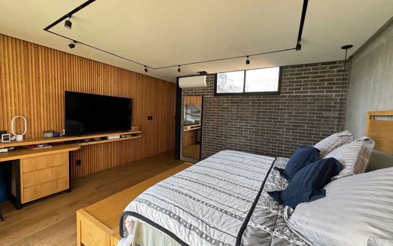 En segundo nivel cuarto de TV y recamara principal con gran terraza arbolada, precioso baño con vestidor.