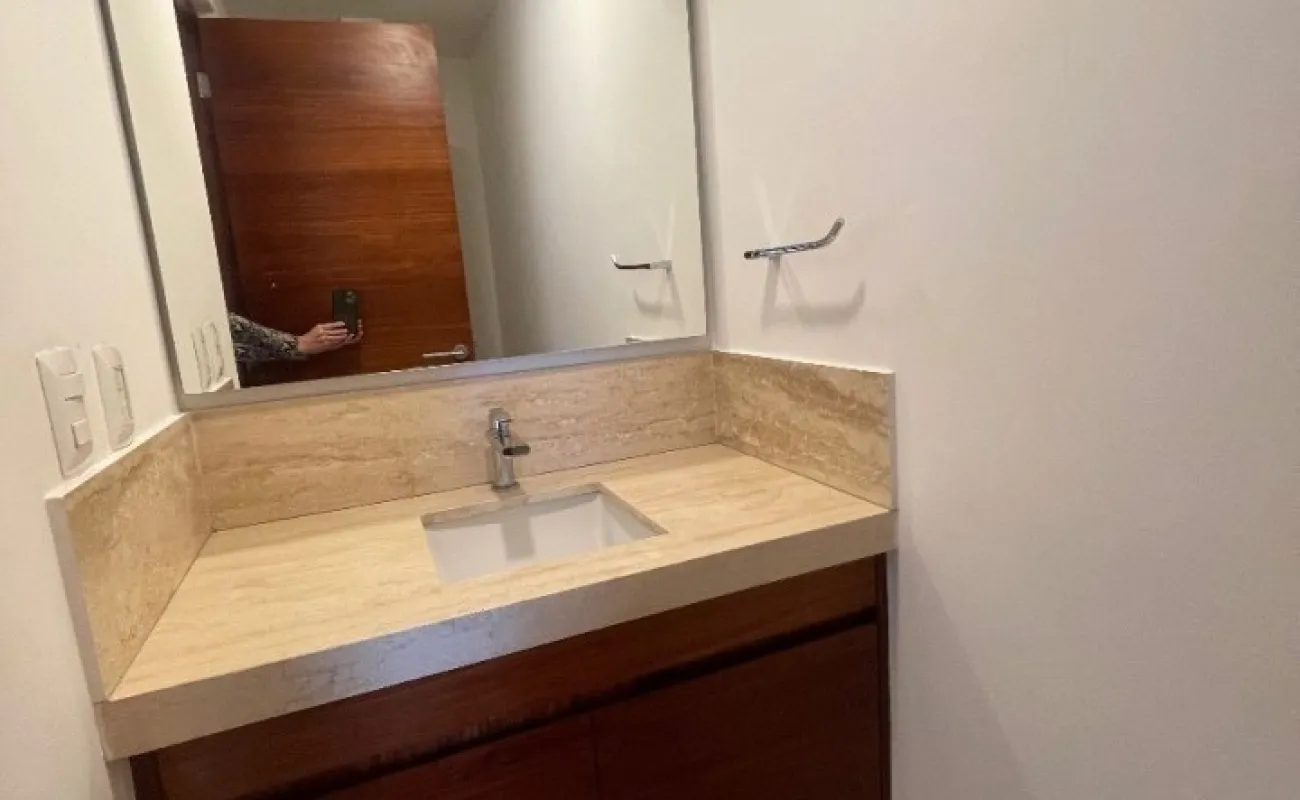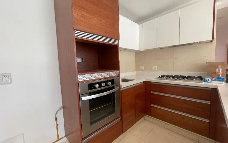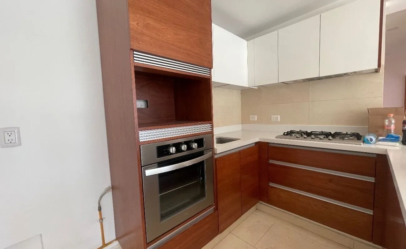 Cocina equipada con barra y contiguo a ésta, el área de lavado. Tiene 2 estacionamientos fijos en sótano 3.