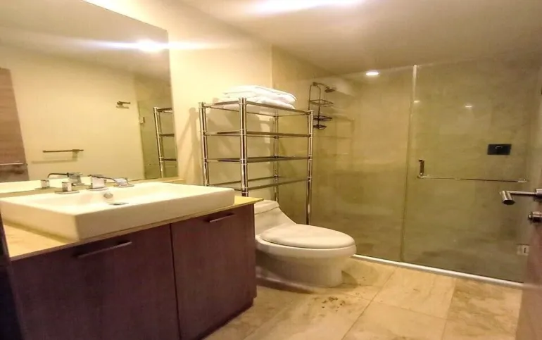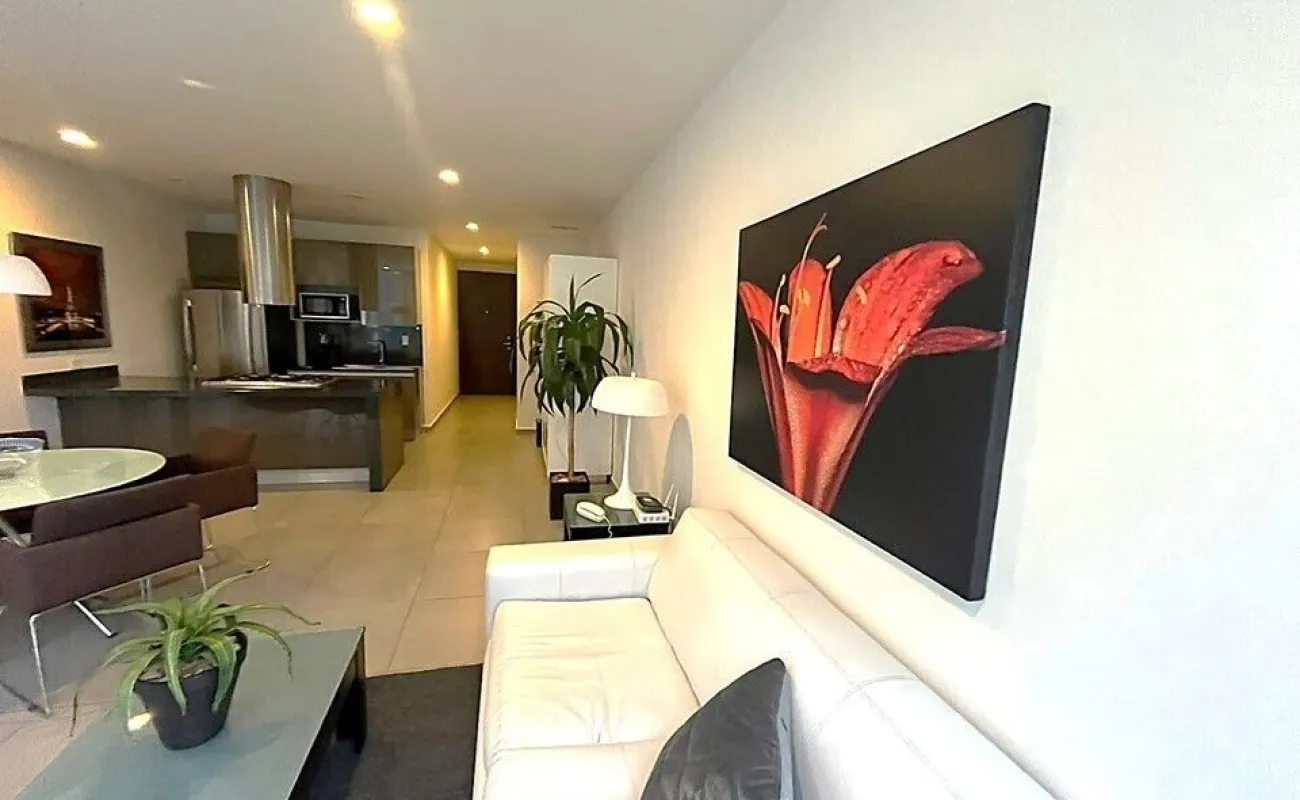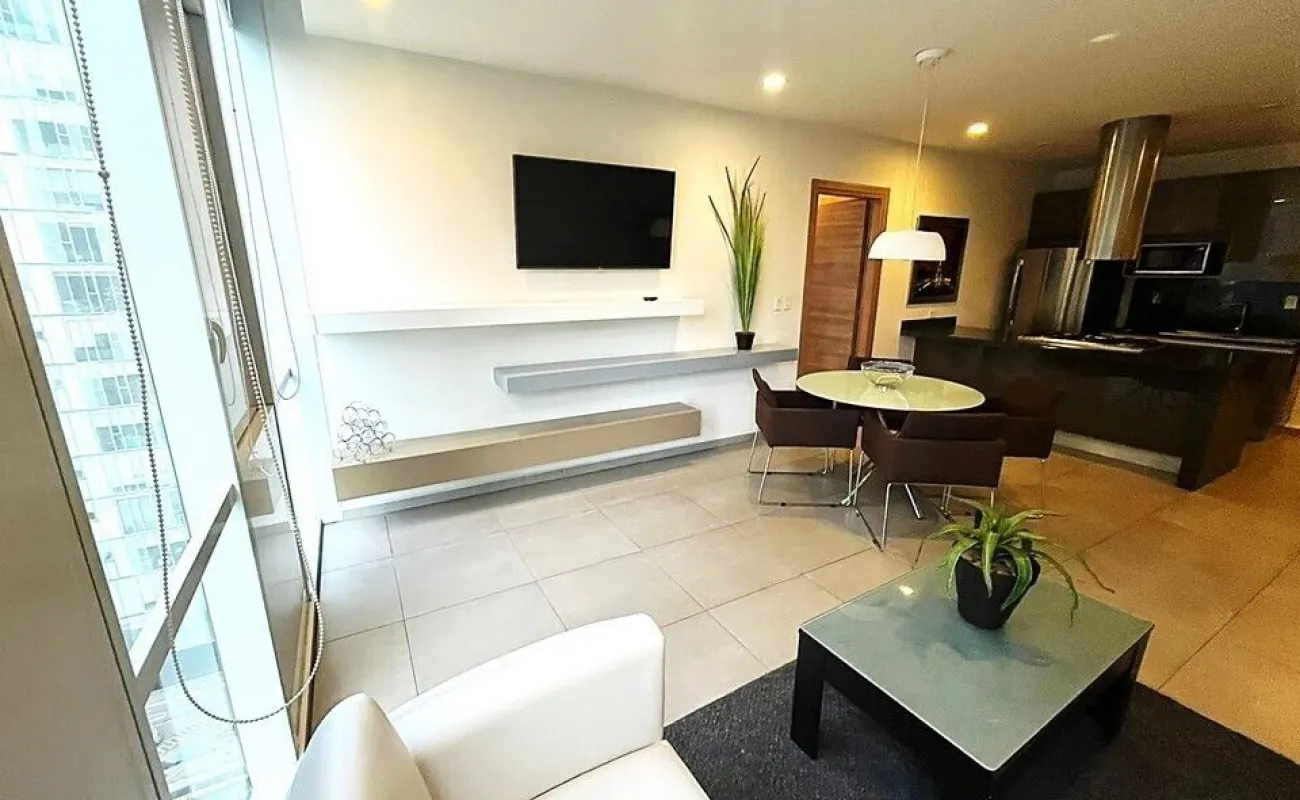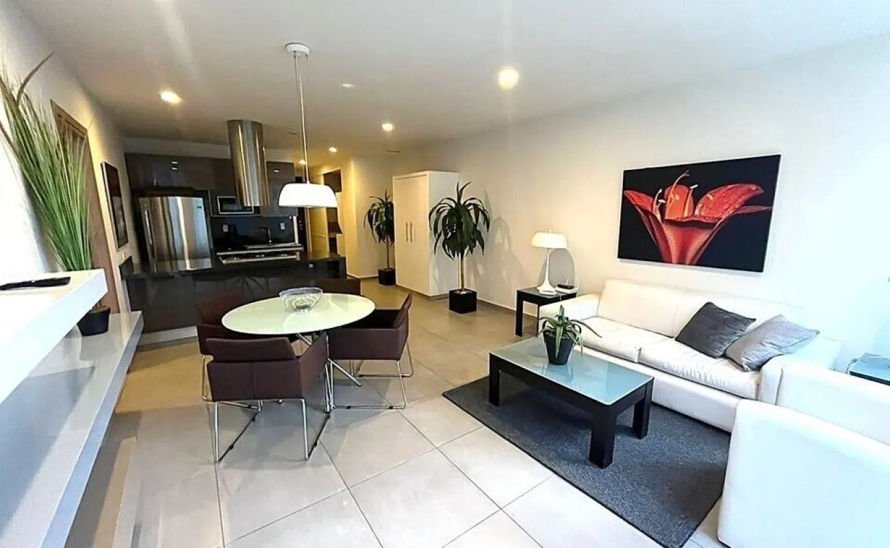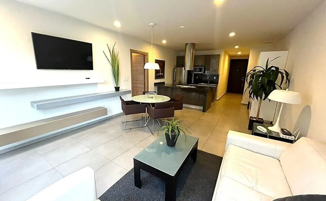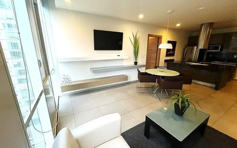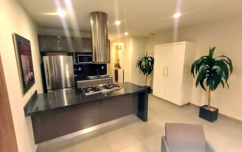 Descripción: Este moderno departamento cuenta con una amplia sala y comedor de concepto abierto, una cocina funcional con barra, lavandería independiente, y una recámara principal con baño privado y vestidor.