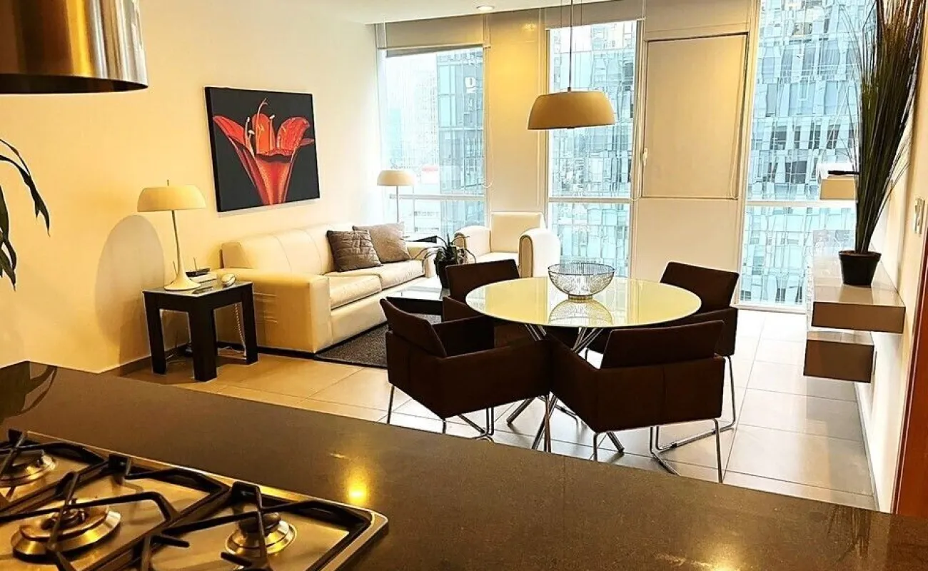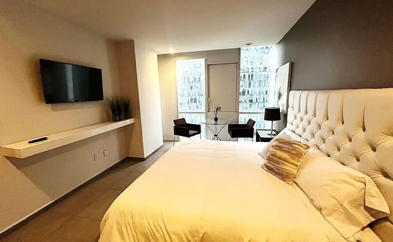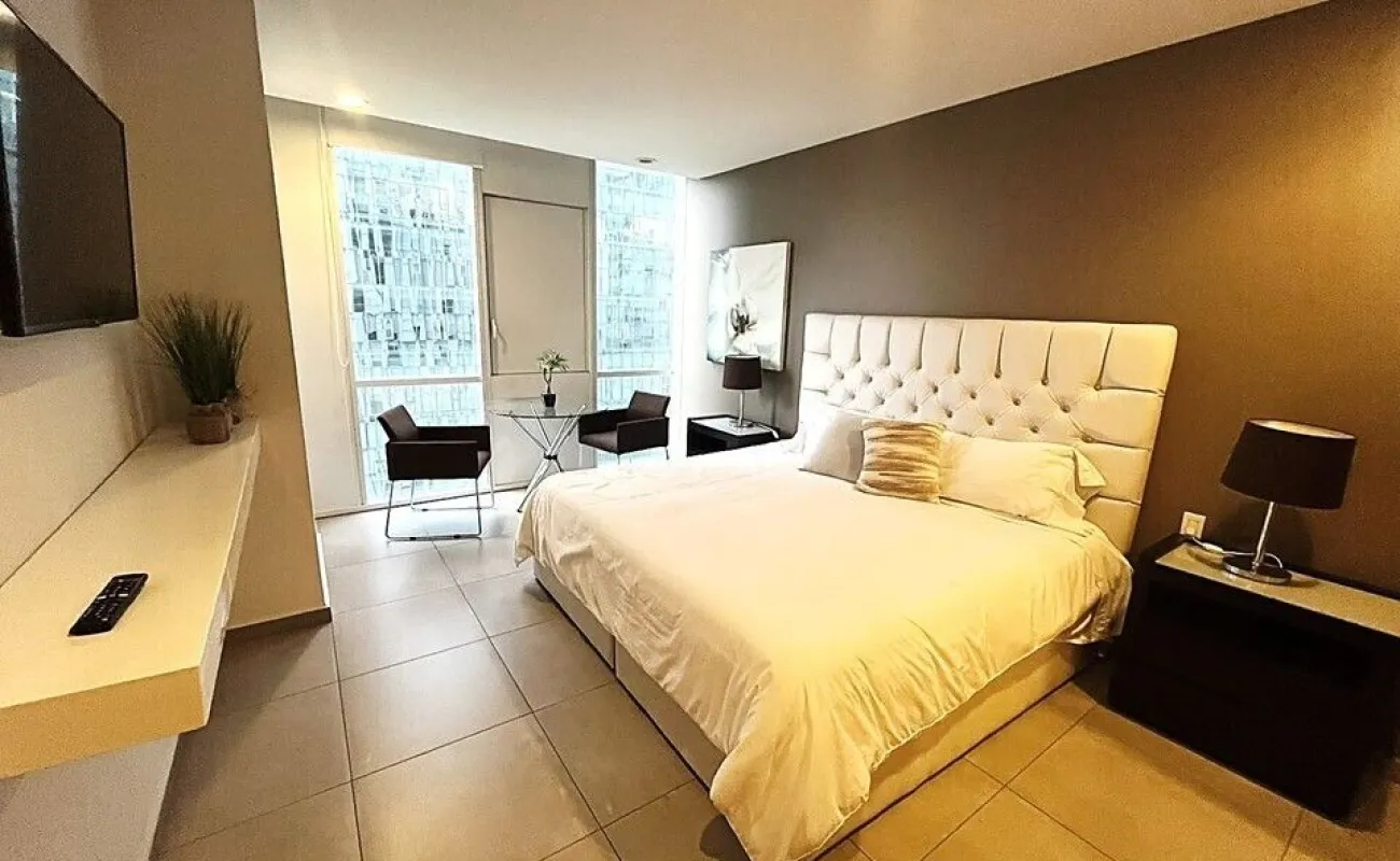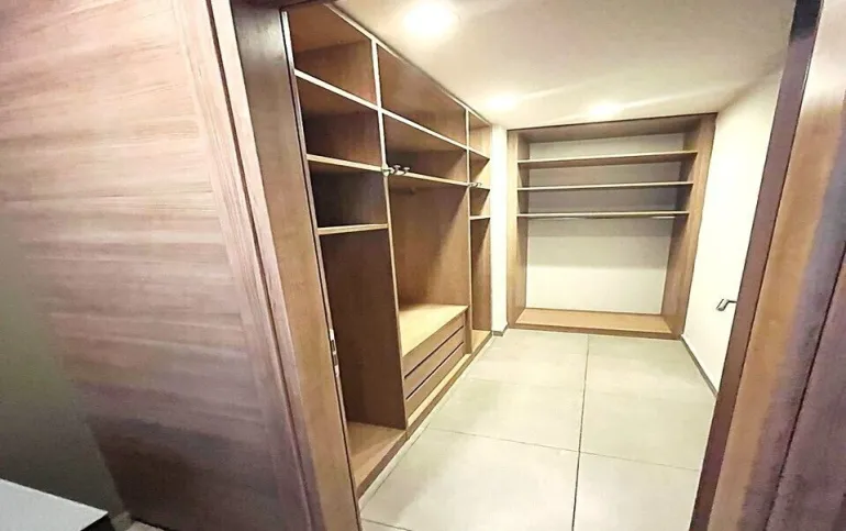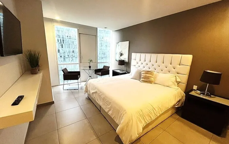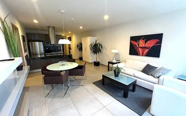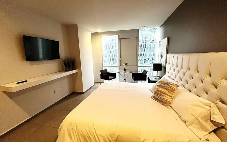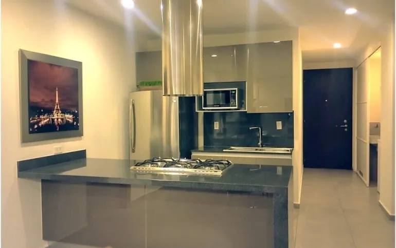 Descripción: Este moderno departamento cuenta con una amplia sala y comedor de concepto abierto, una cocina funcional con barra, lavandería independiente, y una recámara principal con baño privado y vestidor.