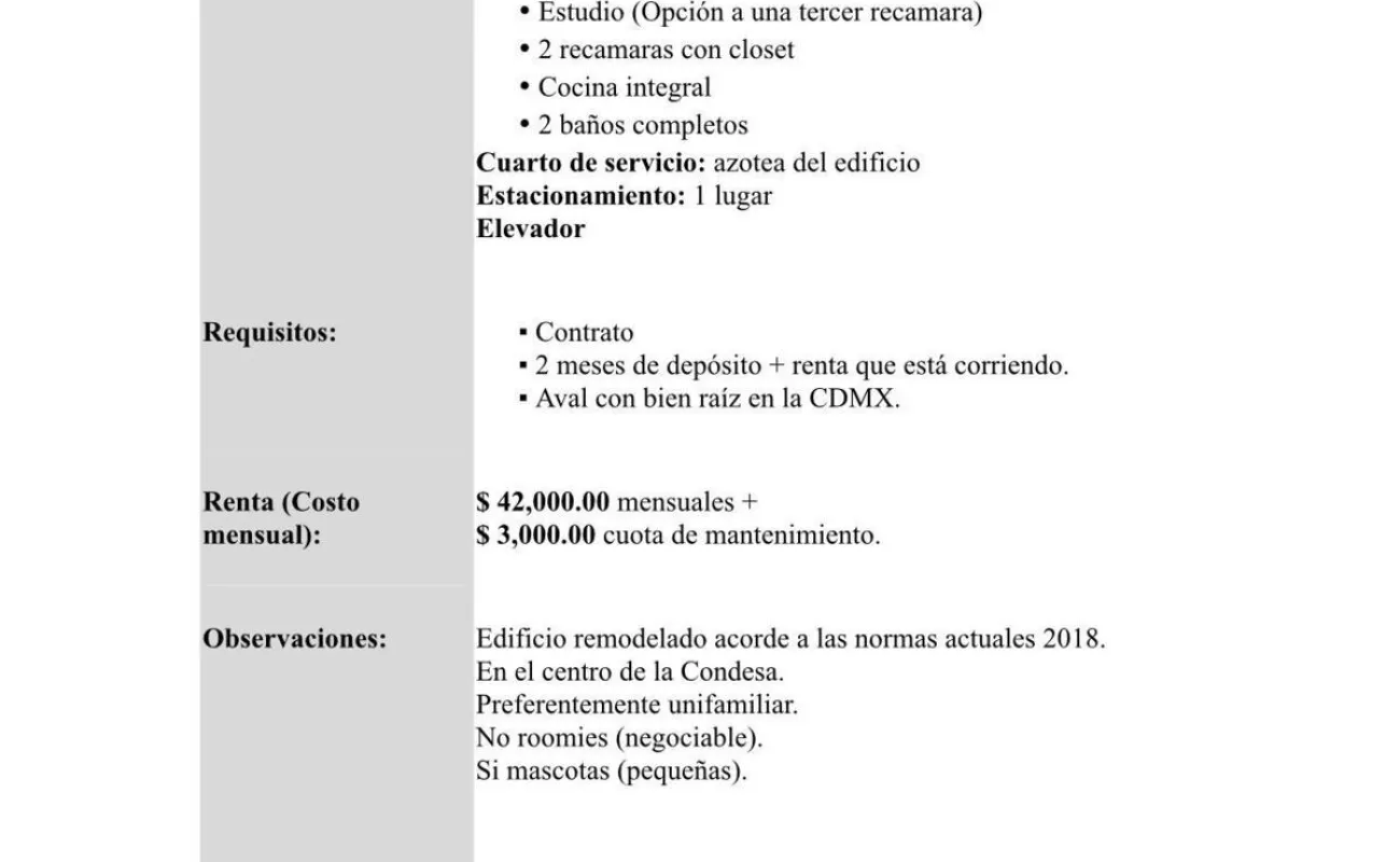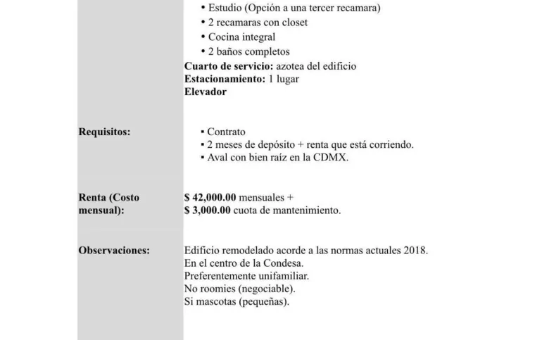 Lindo departamento con terraza en Michoacán, Condesa. El departamento tiene 150 m2. Tiene sala, comedor y cocina abierta. Cuenta con 2 recámaras y con 2 baños completos. Cuenta también con estudio (que podría ser una tercera recámara. Tiene cuarto de servicio en la azotea. Tiene 1 lugar de estacionamiento. El departamento está en un primer piso. El edificio tiene elevador. Precio : $45,000 pesos con mantenimiento incluido