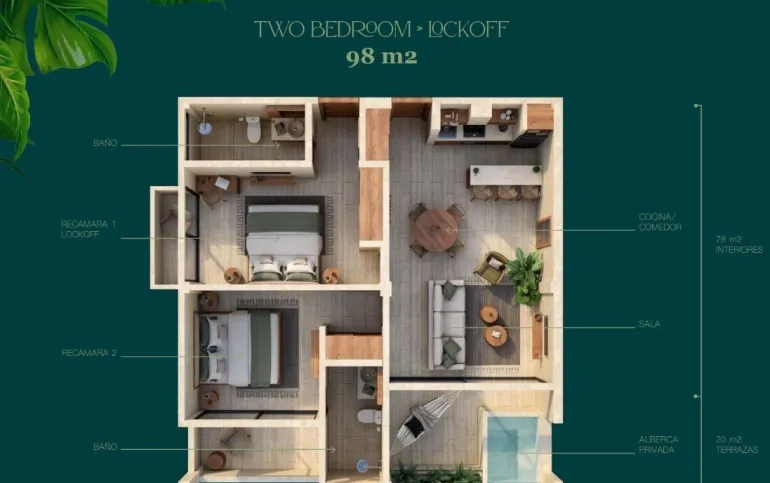 Departamento en Venta – Mahahual, Quintana Roo Descubre este acogedor departamento de 98m² ubicado en el encantador malecón peatonal de Mahahual, un pequeño paraíso que combina tranquilidad, belleza natural y el auténtico Caribe mexicano. Ubicación privilegiada: A 2 horas al sur de Tulum o 1.5 horas al norte de Chetumal, donde se encuentra el aeropuerto más cercano. Situado en el malecón peatonal de 1.7 km, rodeado de restaurantes, bares, centros de buceo, tiendas de souvenirs, hoteles y clubes de playa. Frente al segundo arrecife de coral más grande del mundo, ideal para quienes buscan una conexión con la naturaleza y el mar turquesa. Características del Departamento: • 2 Recamaras • Interior: 78 m² • Terraza: 20 m² • Total: 98 m² • Vista al mar Caribe, ideal para disfrutar amaneceres. • Disponible para Abril 2025 Amenidades destacadas: Rooftop con infinity pool y vista panorámica al mar Caribe, perfecta para relajarse y desconectar del día a día. Precio: $6,793,500 MXN (+ $2.5 USD/m² de mantenimiento). Nota: Los precios publicados, disponibilidad del inmueble u otras condiciones podrán ser sujetos a cambio sin previo aviso. Toda la información y medidas provistas son aproximadas y se proporcionan con fines informativos, por lo que deberán ser confirmados en la documentación pertinente. La información corresponde a los últimos datos recabados y deberá confirmarse. Fotografías no vinculantes ni contractuales.