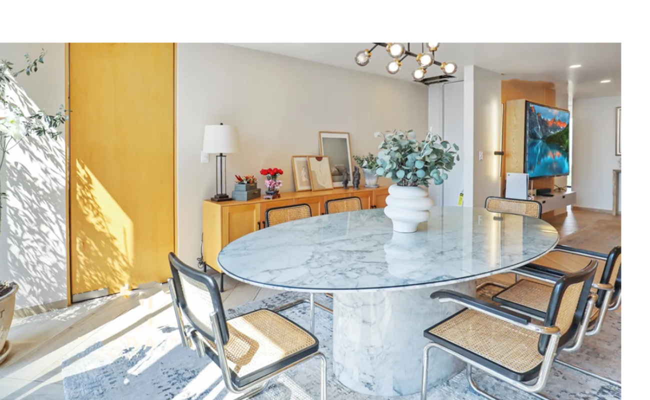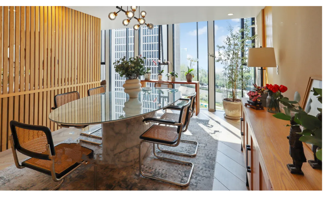 Sala y comedor con ventanales de piso a techo