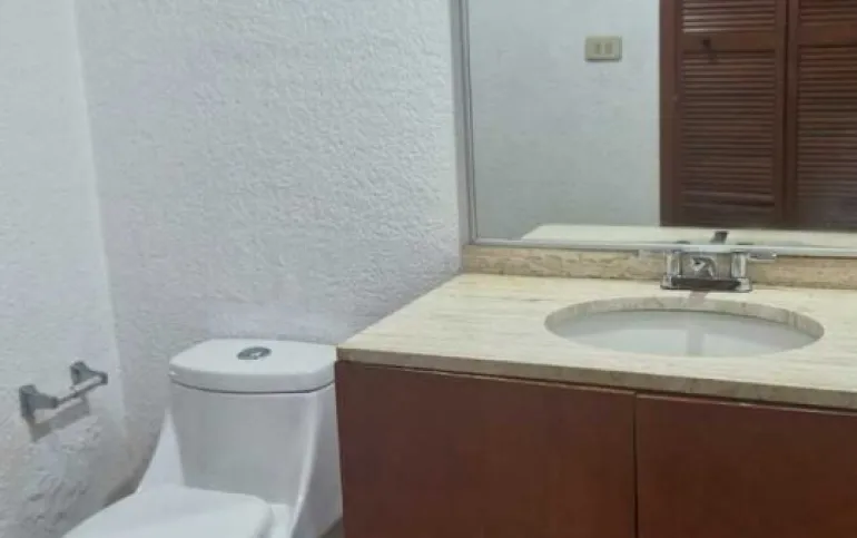 - 1 baño completo con mueble de madera y ventilación