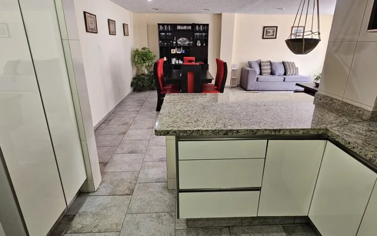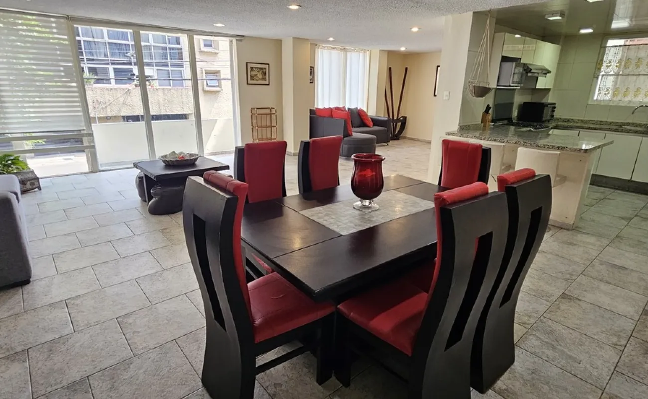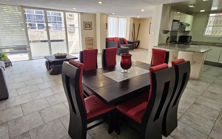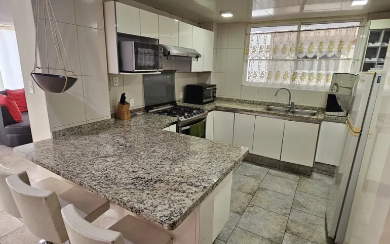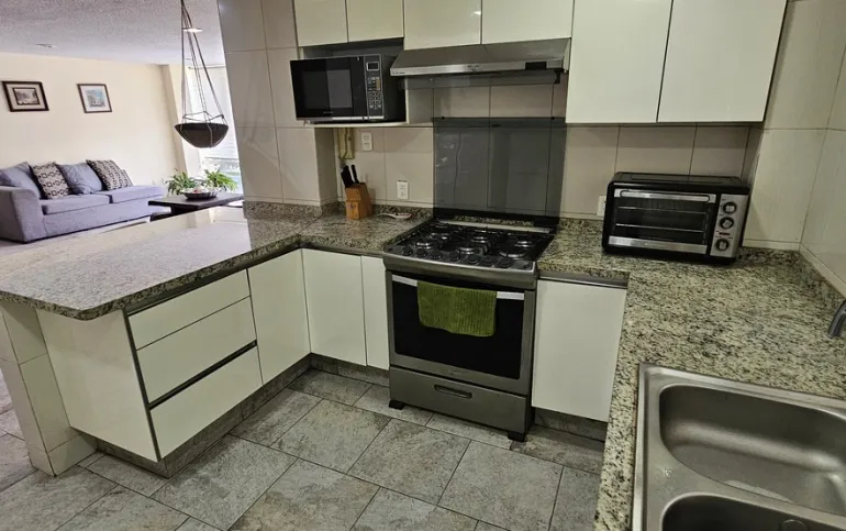 Amplia estancia sala-comedor con balcón, cocina integral abierta con barra de granito, cuarto de lavado integrado, baño completo para visitas y para recámara junior, recámara principal con closet y baño, recámara junior con closet y terraza, cuarto de servicio con baño integrado en la azotea, 1 cajón de estacionamiento.