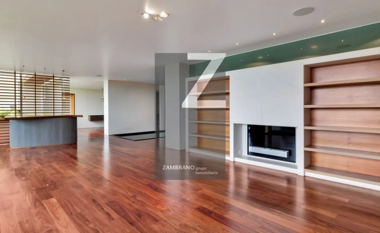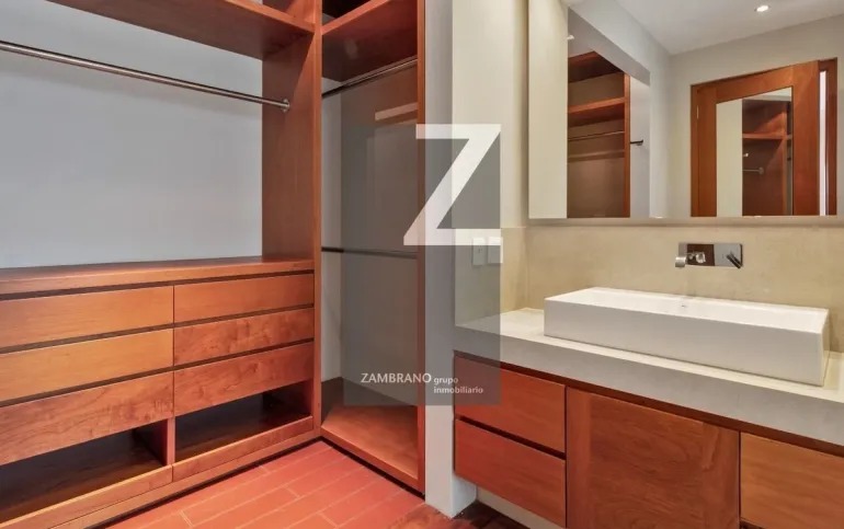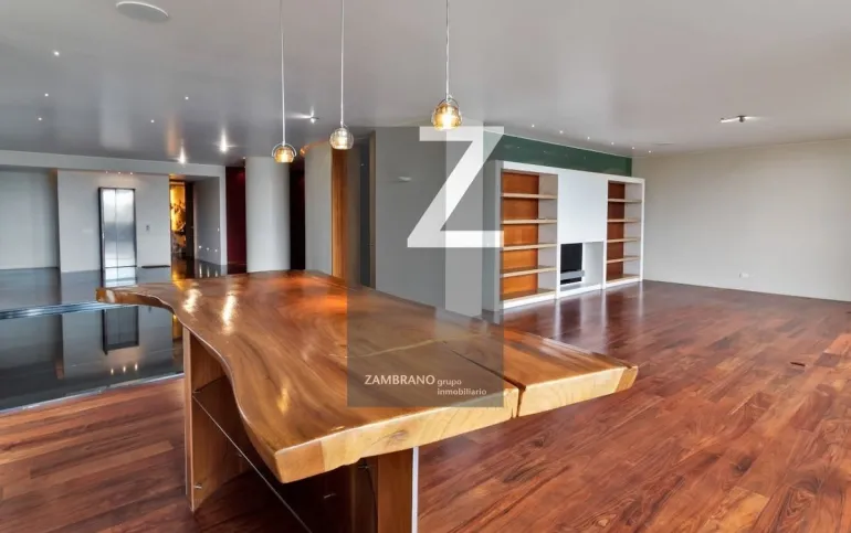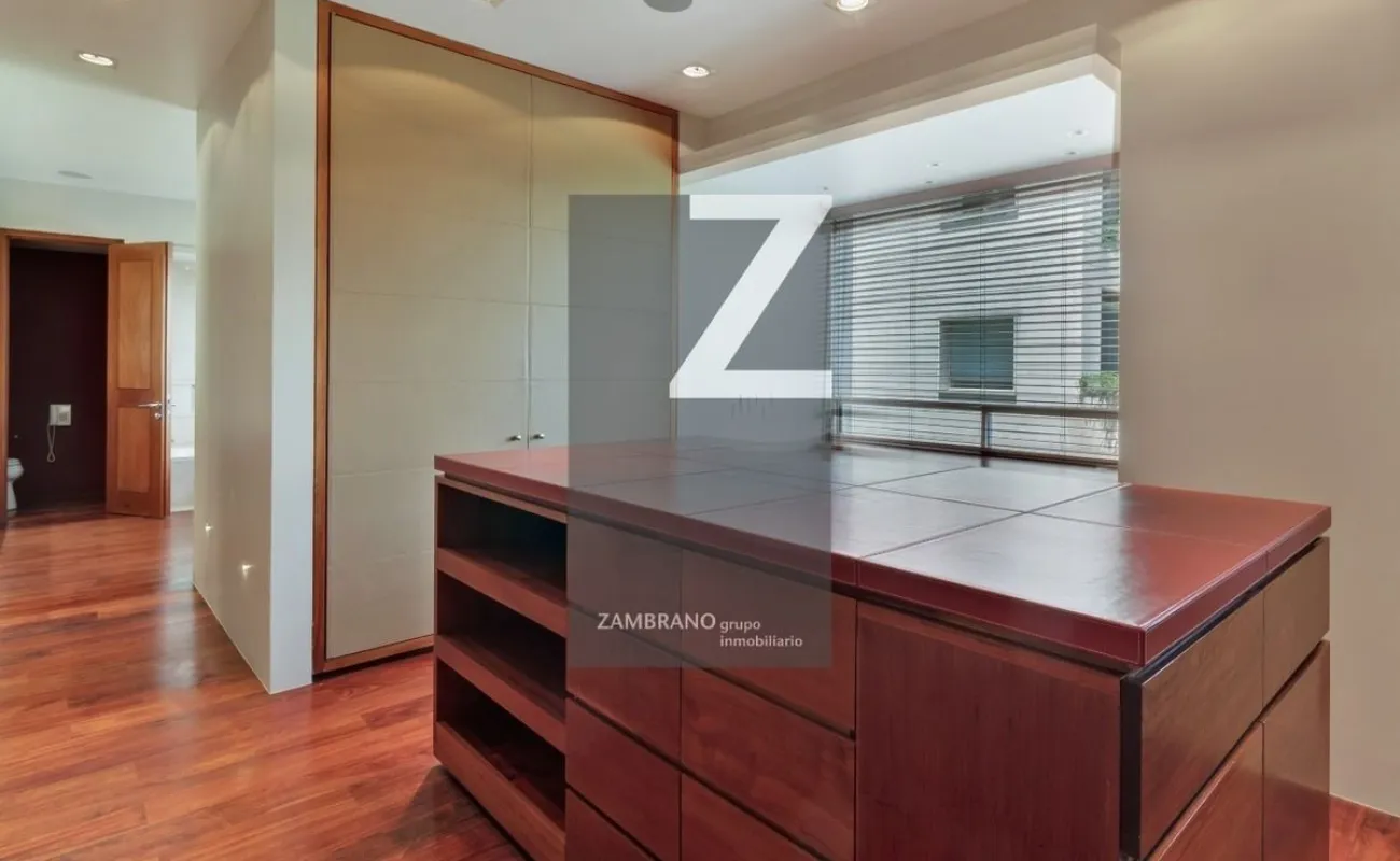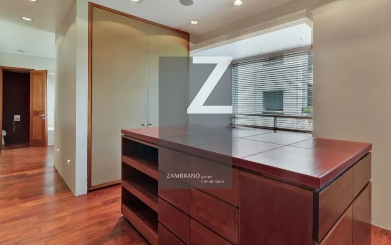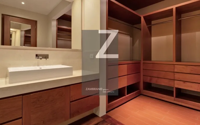 El departamento tiene 520m2, cuenta con tres recamaras todas con baño y closet - vestidor,amplios espacios para sala comedor,bar y cuarto de televisión.
