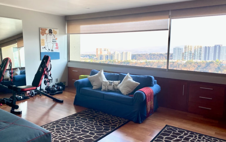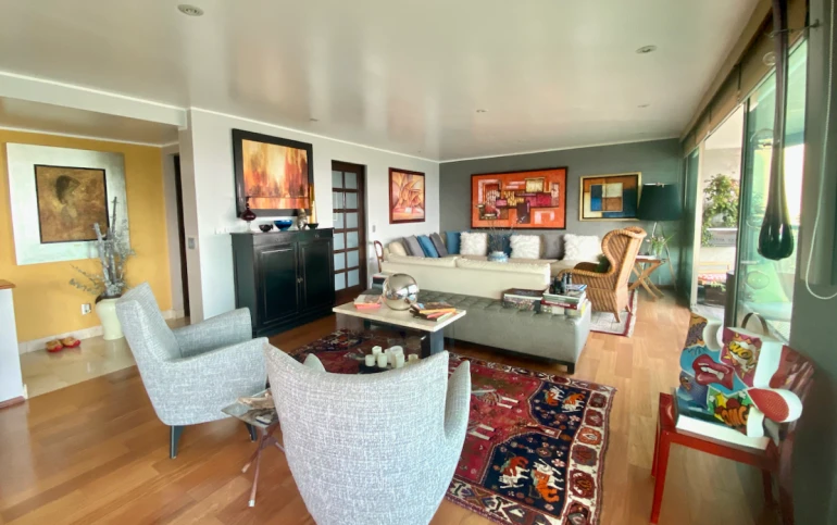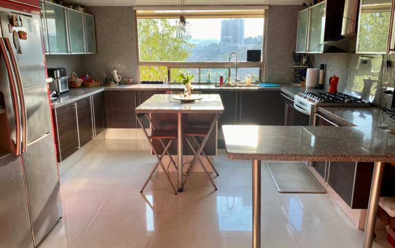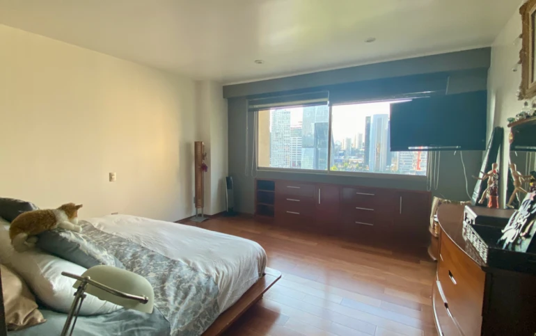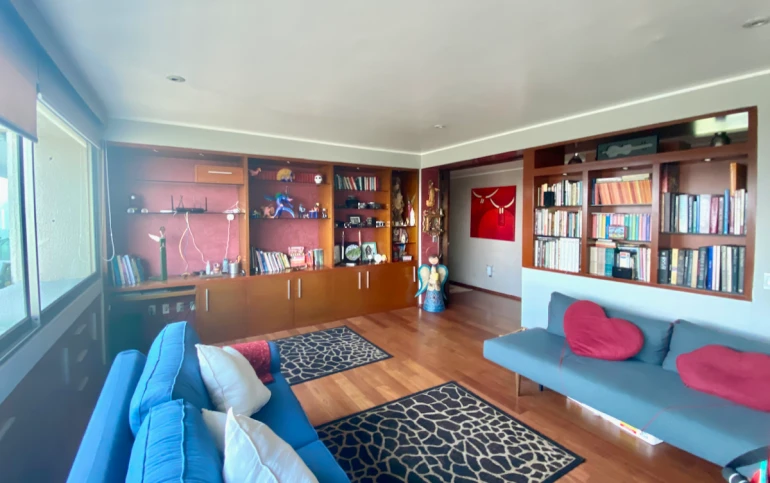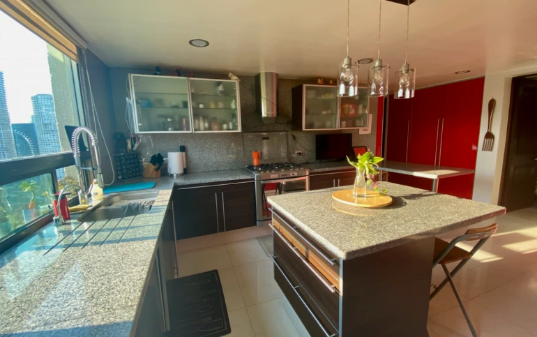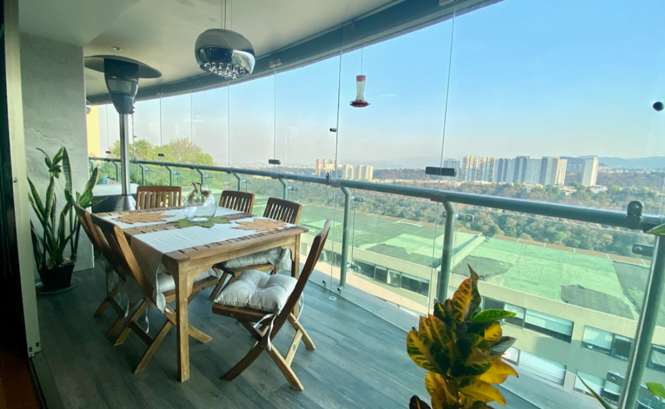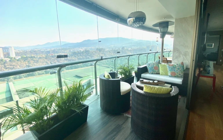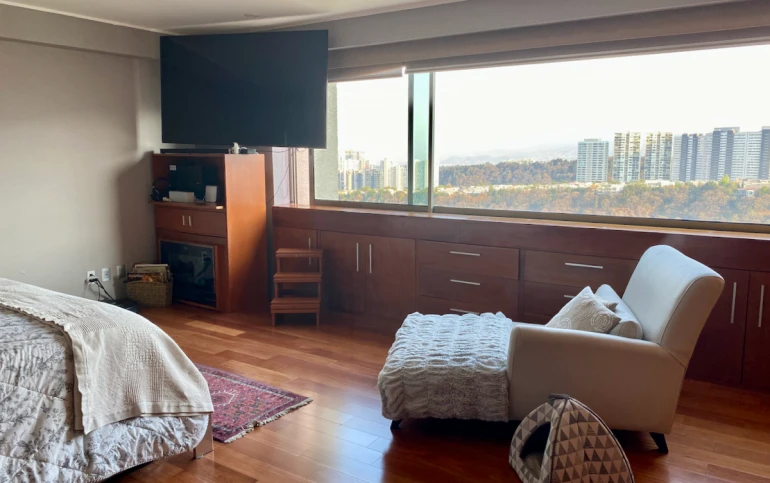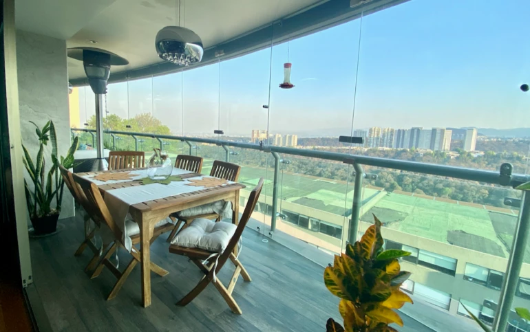 Precioso departamento con amplios espacios, finos acabados, mucha luz natural y vista panorámica desde todas las áreas. Cuenta con amplia área social que se integra completamente a la terraza. La cocina es cerrada con acceso al family- desayunador. Además, tiene un espacioso cuarto de TV y tres recámaras con baño propio, la principal con vestidor y closet. Amenidades: alberca techada, gimnasio jardín con juegos infantiles y salón de usos múltiples. Condominio con estricta vigilancia.