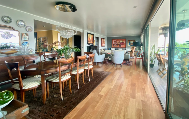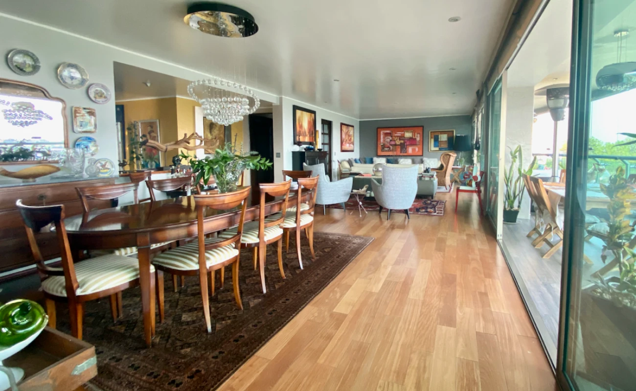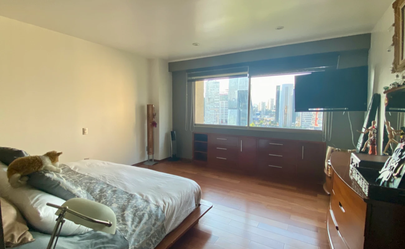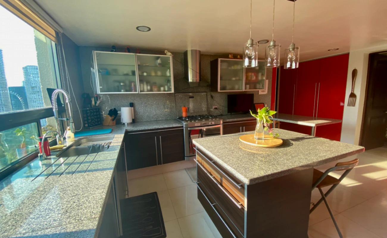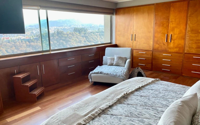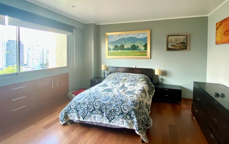 Precioso departamento con amplios espacios, finos acabados, mucha luz natural y vista panorámica desde todas las áreas. Cuenta con amplia área social que se integra completamente a la terraza. La cocina es cerrada con acceso al family- desayunador. Además, tiene un espacioso cuarto de TV y tres recámaras con baño propio, la principal con vestidor y closet. Amenidades: alberca techada, gimnasio jardín con juegos infantiles y salón de usos múltiples. Condominio con estricta vigilancia.