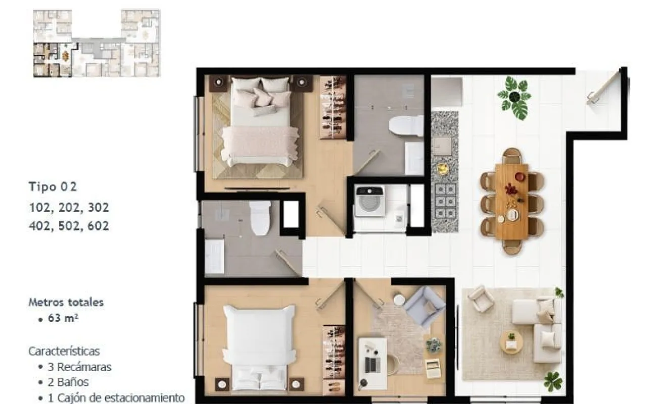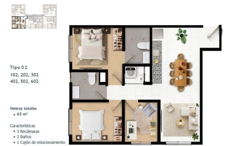 63 m² | 3 recámaras | 2 baños