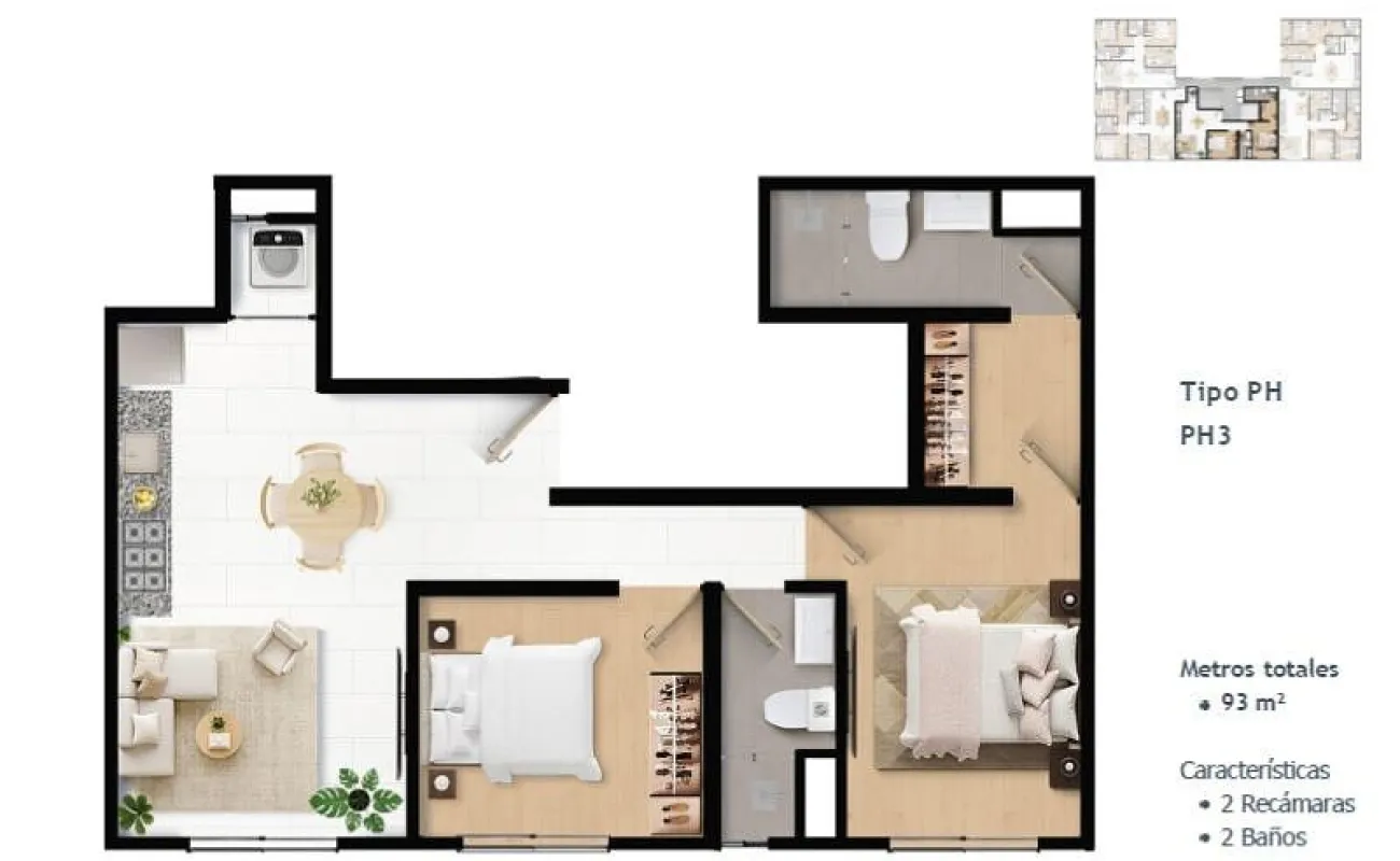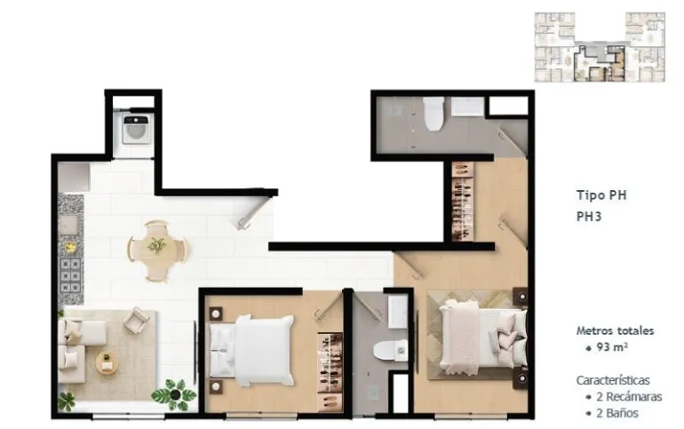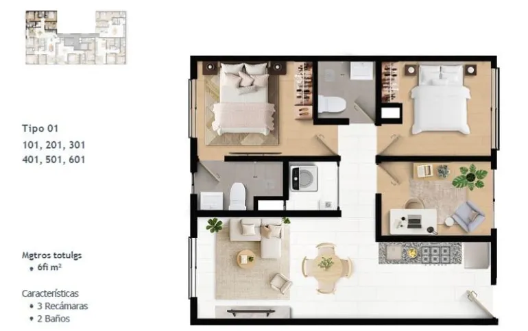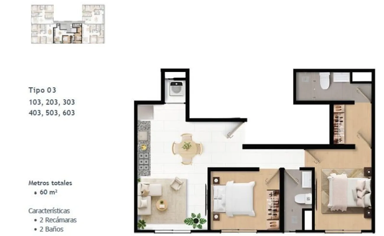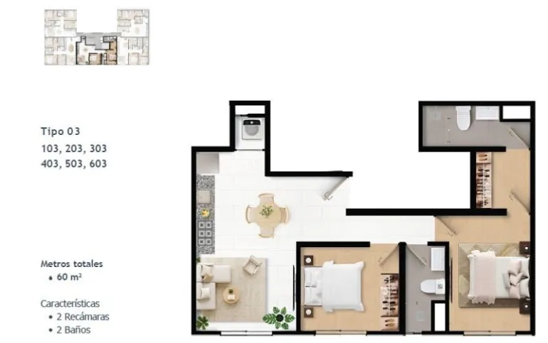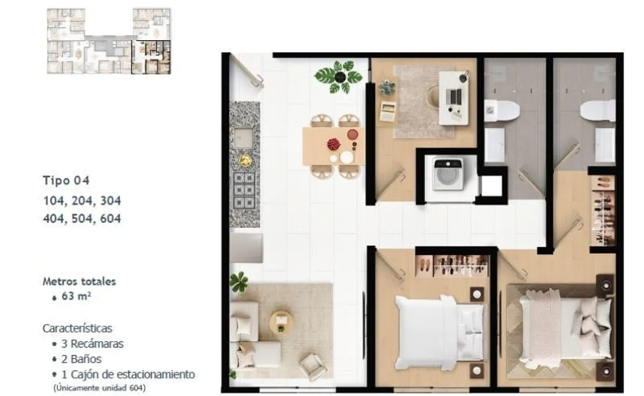 Superficies desde 60 m² hasta 104 m², en configuraciones de 2 y 3 recámaras: