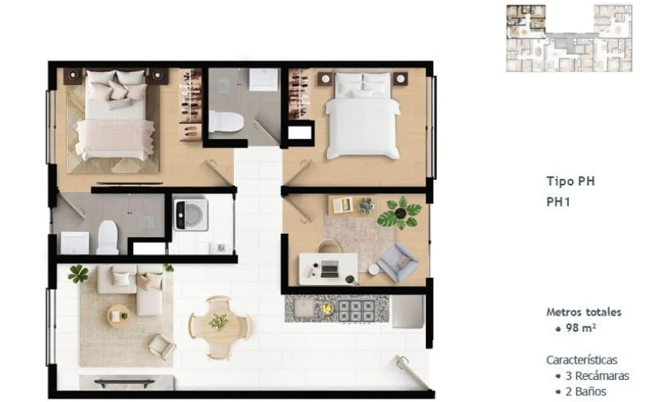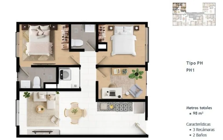 98 m² | 3 recámaras | 2 baños