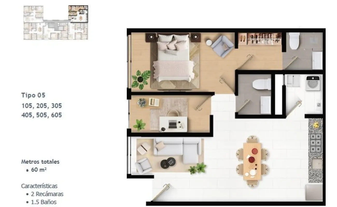 60 m² | 2 recámaras | 1.5 – 2 baños