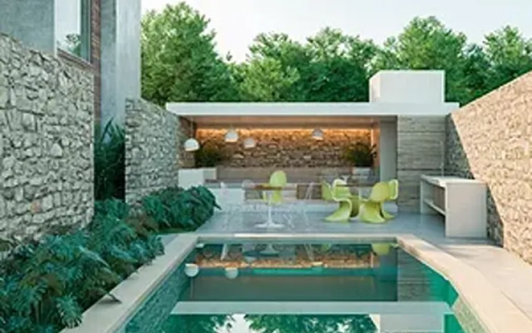 Cuenta con zona social que se compone de una piscina integrada a una terraza-asoleadero con asador y living lounge techado entre espacios jardinados.