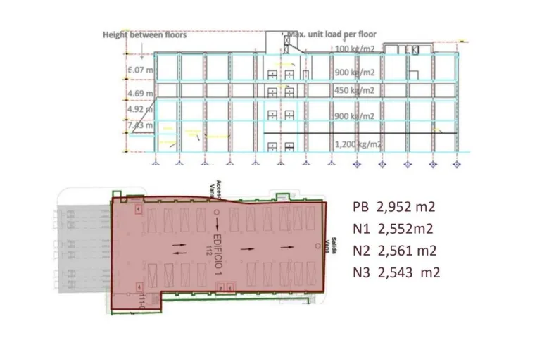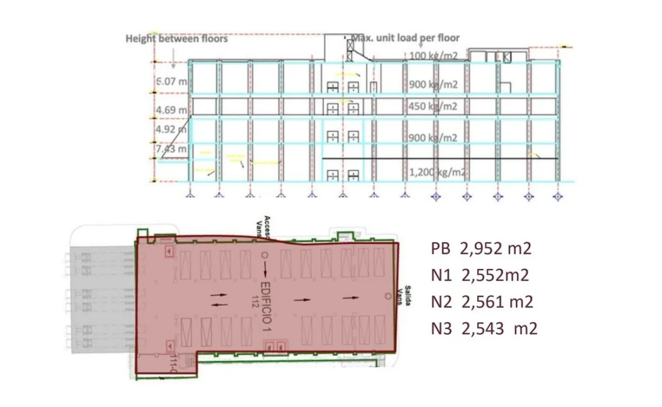 •Área total : Rentable 4 pisos total de 10,609m2, divisible en 2,500 m2 de bodega por piso.