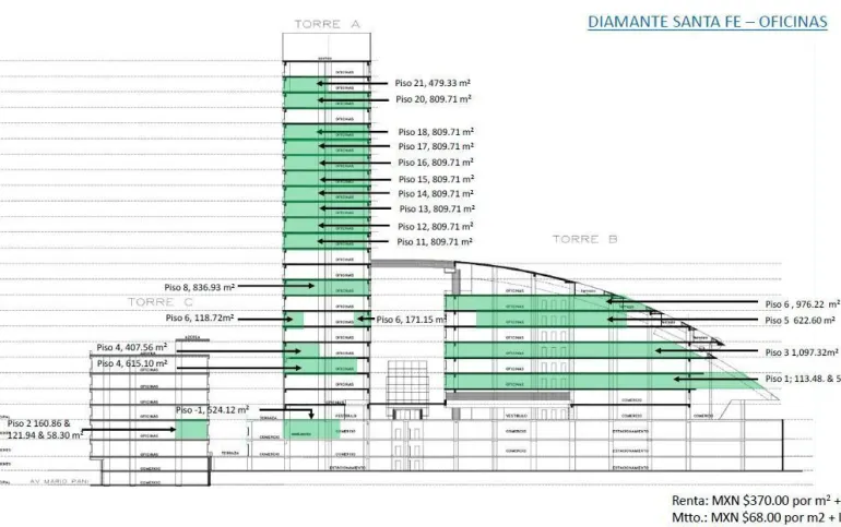 Edificio inteligente con dos torres de oficinas. La primera con 22 niveles y la segunda con 8 y 3 niveles de área comercial. Cuenta con 5 niveles de estacionamiento con capacidad para más de 900 autos.