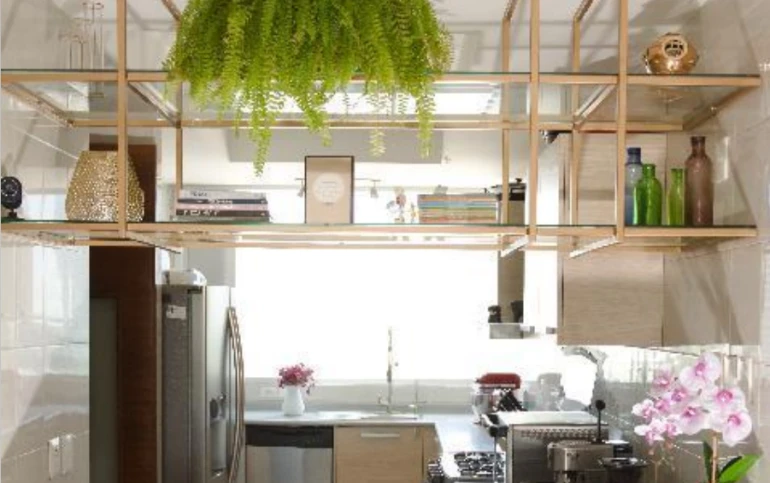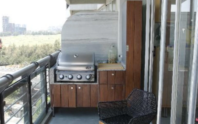 Terraza gourmet con asador y mesa elevable automatica para 4 personas.