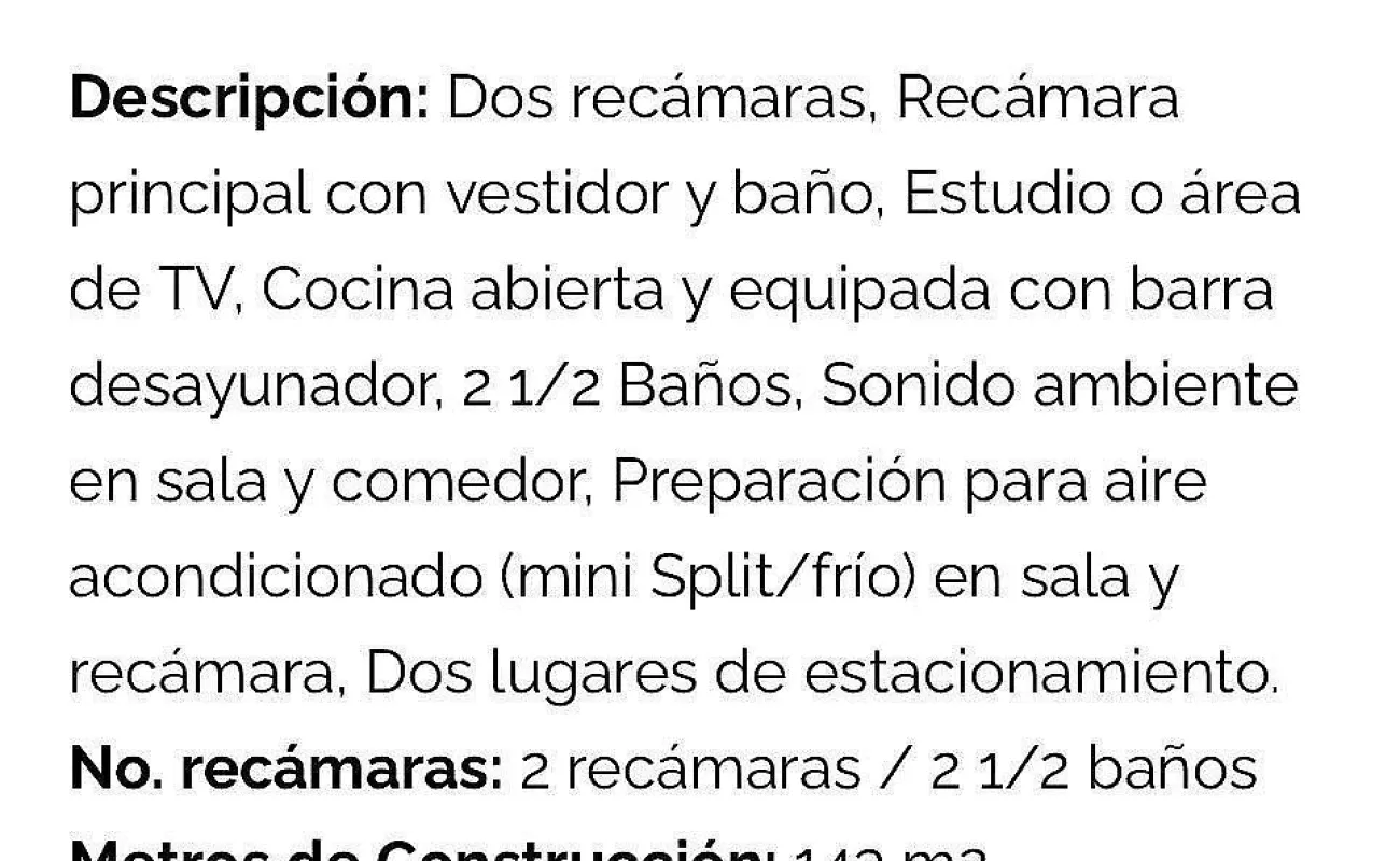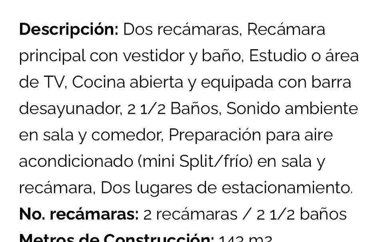 Dos recámaras la principal con preparación de aire acondicionado 2 baños completos, estudio.