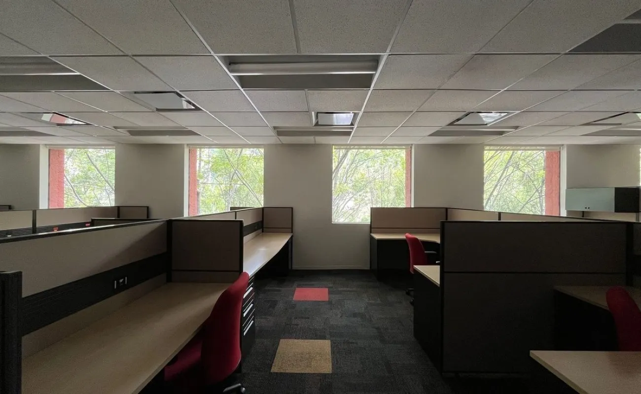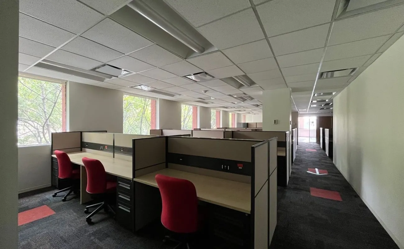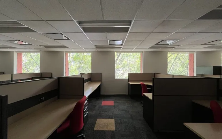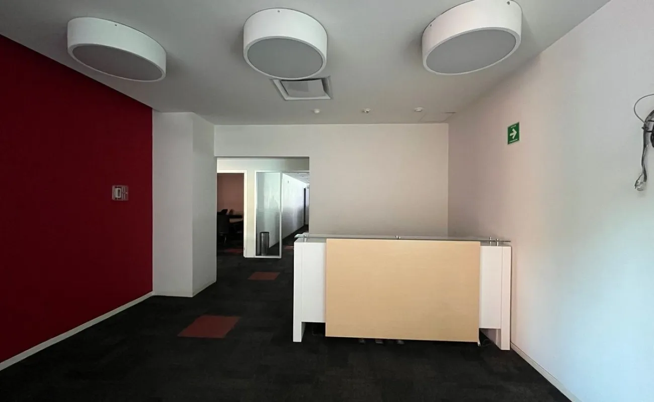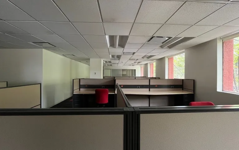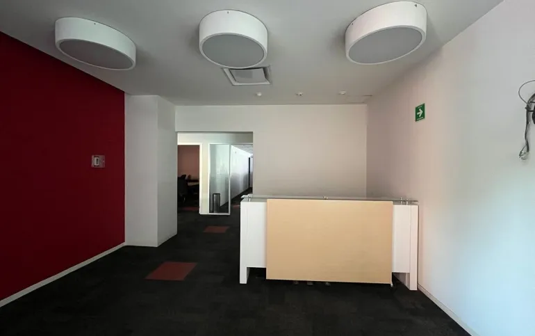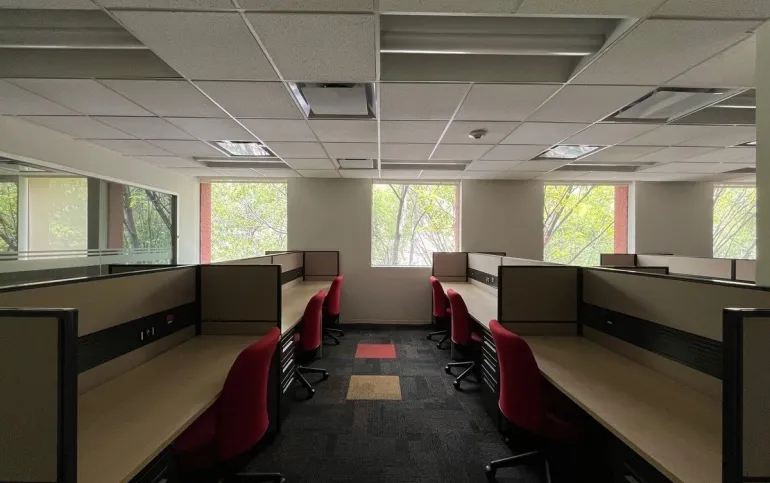 Oficina AMUEBLADA en un corporativo de solo 5 pisos en Santa Fe con excelente seguridad y rodeada de jardines. Tiene 4 sótanos de estacionamientos, 6 elevadores más un montacarga.