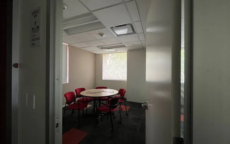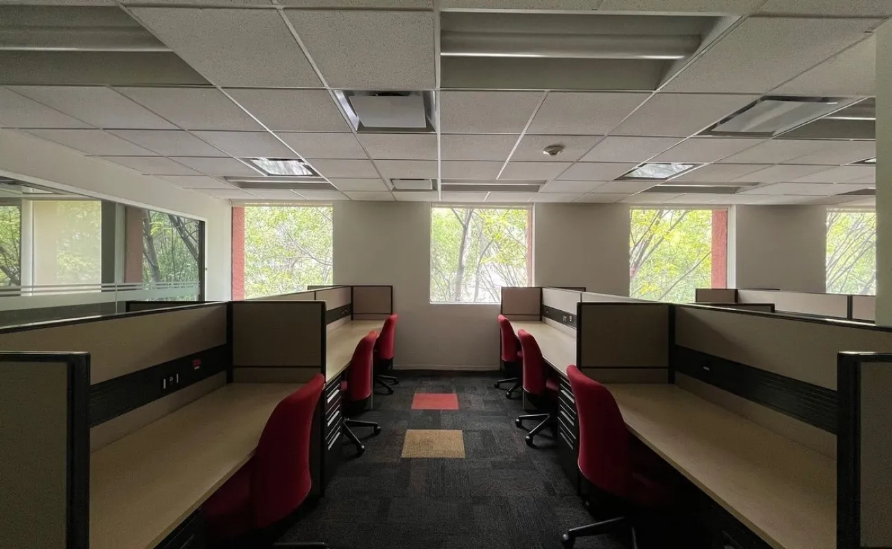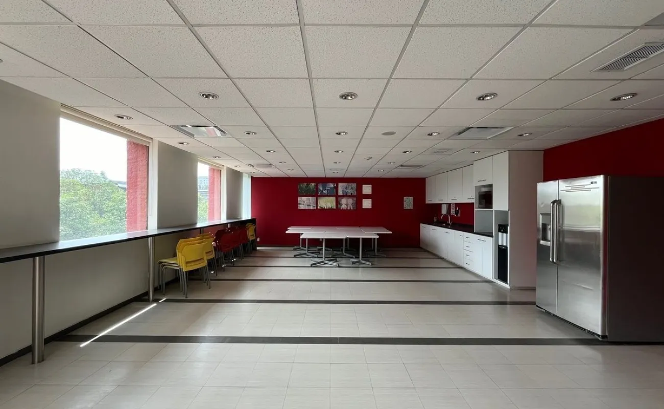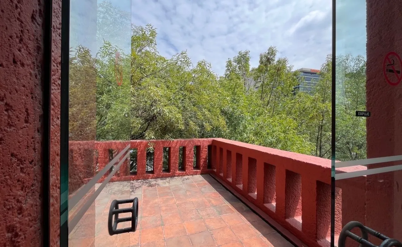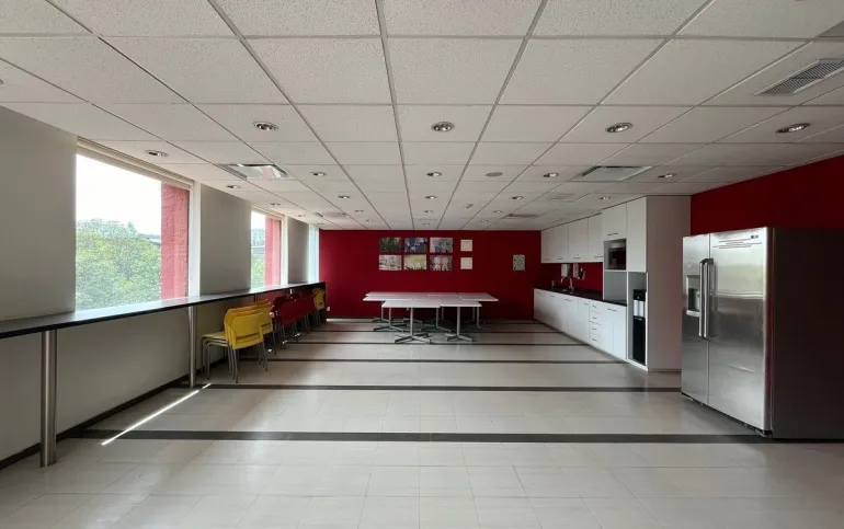Oficina AMUEBLADA en un corporativo de solo 5 pisos en Santa Fe con excelente seguridad y rodeada de jardines. Tiene 4 sótanos de estacionamientos, 6 elevadores más un montacarga.