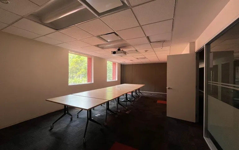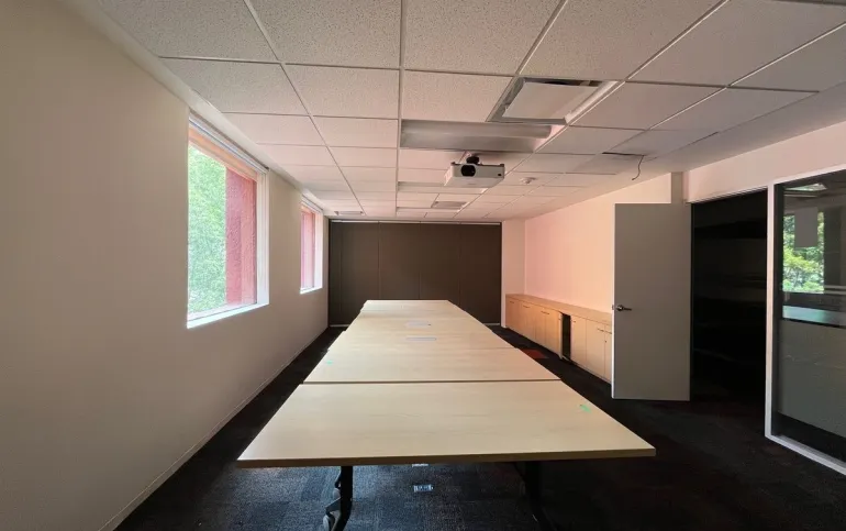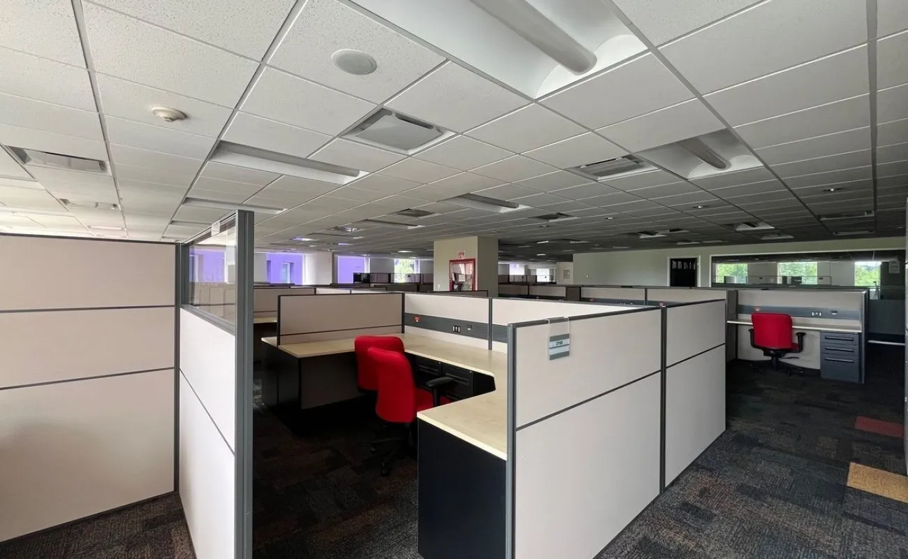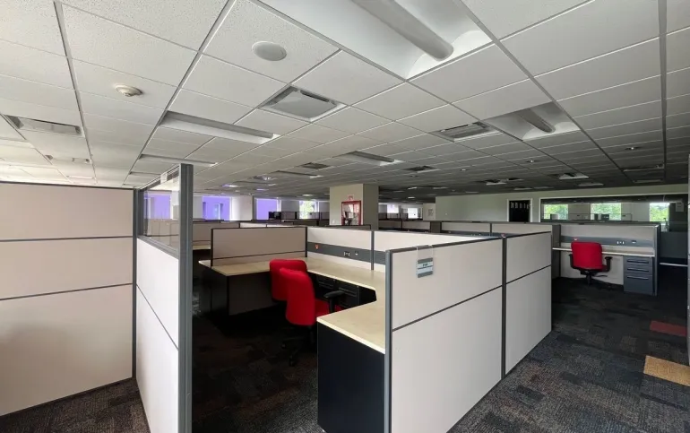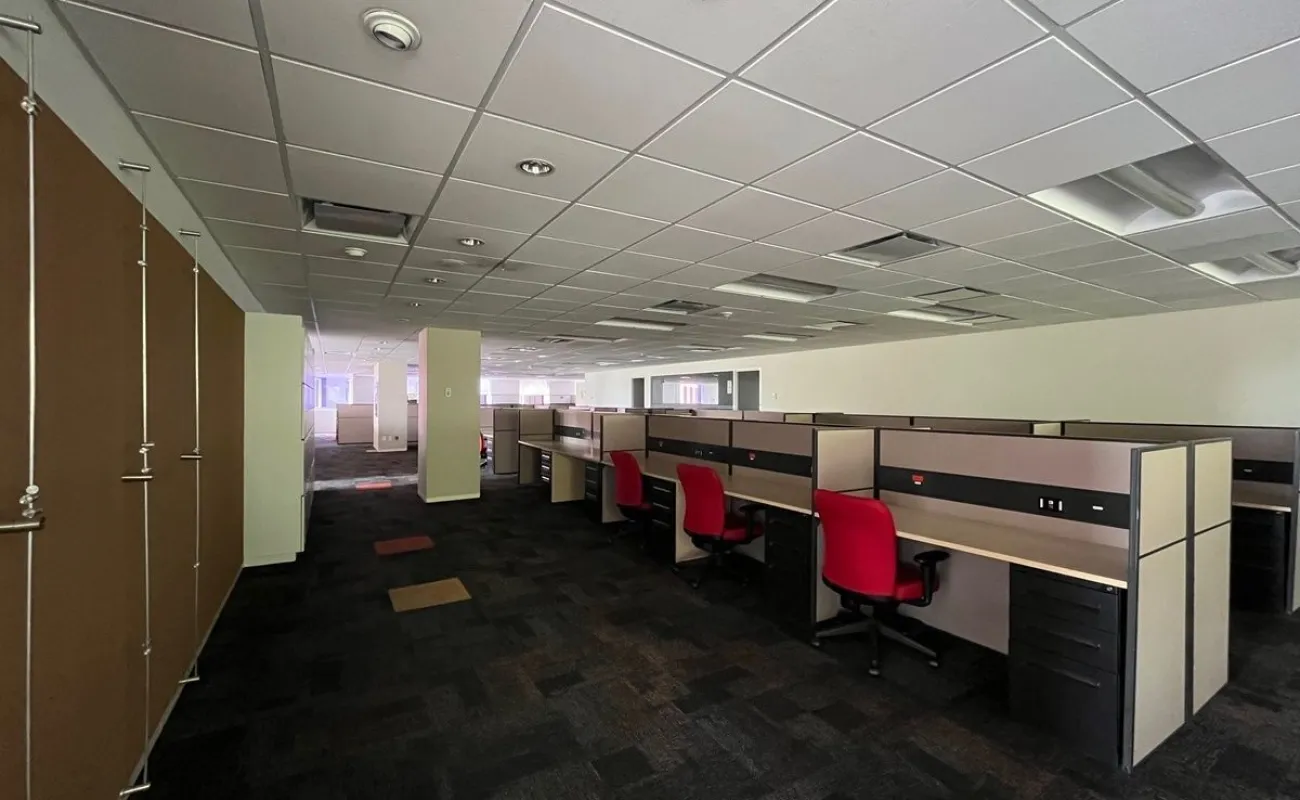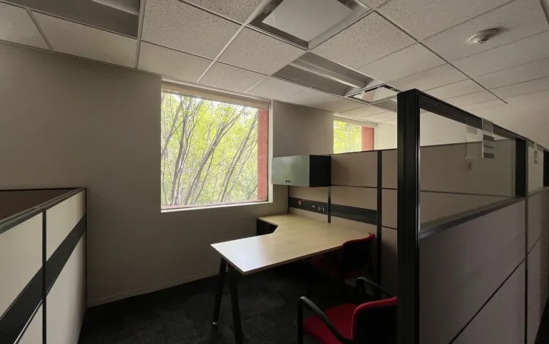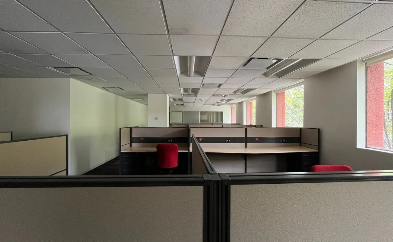 Oficina AMUEBLADA en un corporativo de solo 5 pisos en Santa Fe con excelente seguridad y rodeada de jardines. Tiene 4 sótanos de estacionamientos, 6 elevadores más un montacarga.