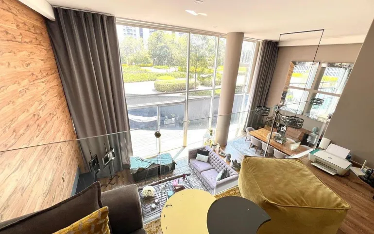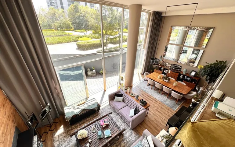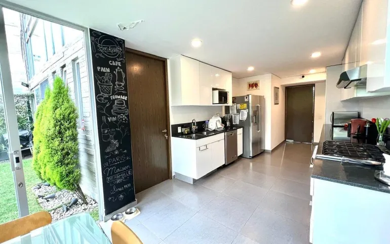 Cuenta con 315 m² de construcción, 60 m² de jardín y 30 m² de terraza. Área social con doble altura en sala, comedor y recibidor; sala con chimenea y salida a la terraza. Medio baño de visitas.
