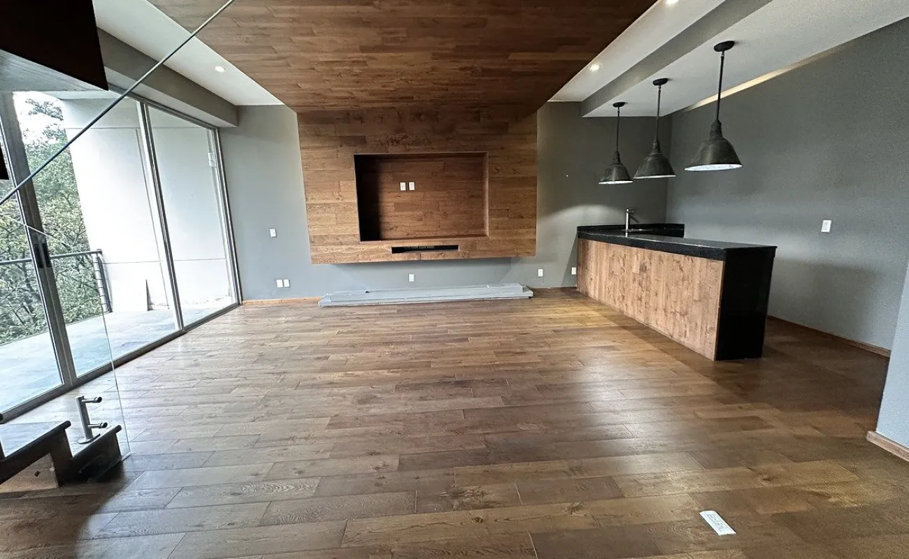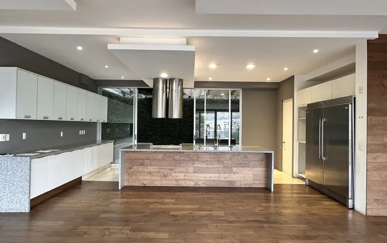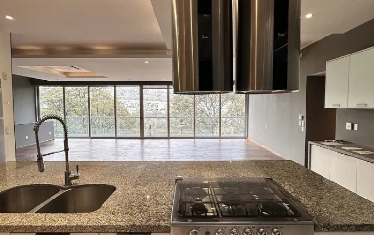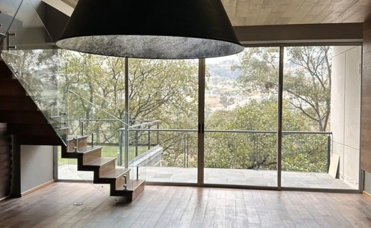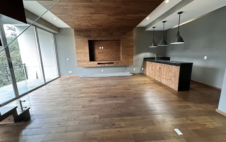 Segundo piso sala comedor con salida a la terraza con lindas vistas arboladas, cocina equipada abierta con refrigerador empotrado, la cocina tiene salida a una amplia terraza con techo removible.