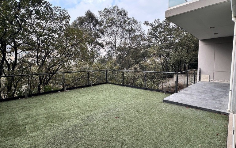 Espectacular garden con vista arbolada en lomas country . El departamento está dividido en dos pisos en la parte baja tiene un área de TV con barra de bar medio baño, terraza y jardín con pasto artificial.