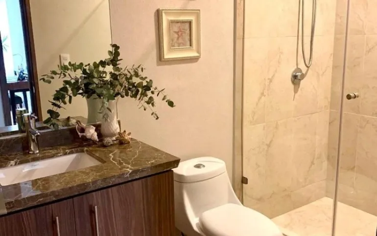 Cuenta con dos recámaras, la principal con vestidor y baño la de usaría con closet y baño afuera de la recámara , sala comedor refrigerador lavasecadora .