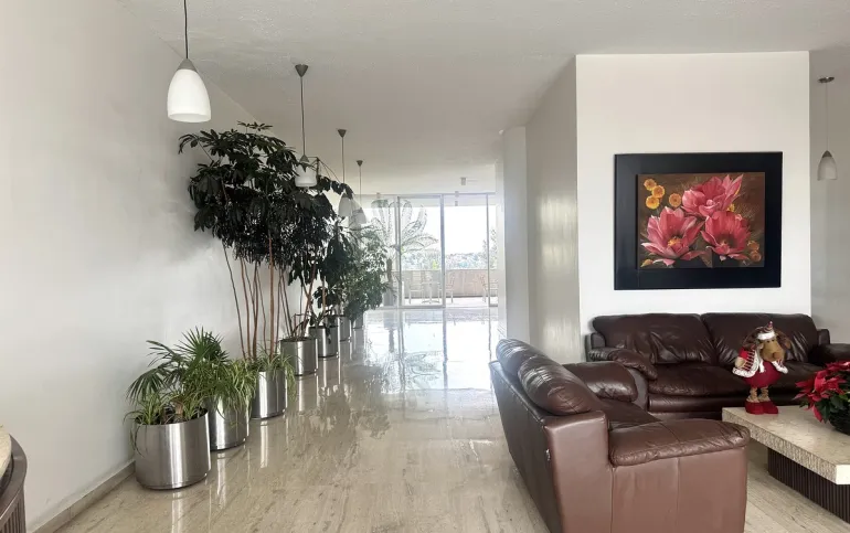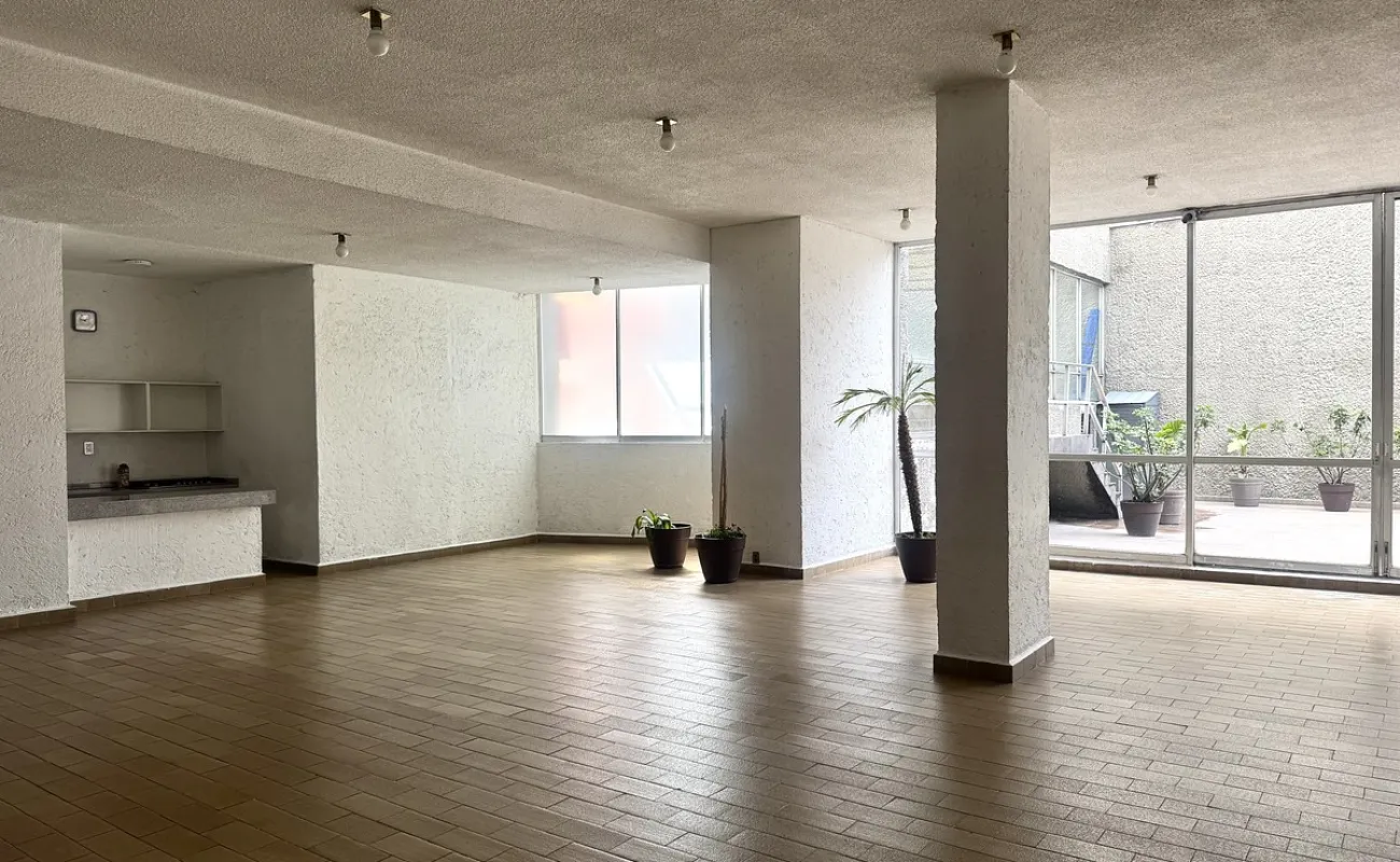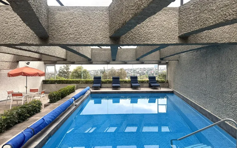 Edificio con amenidades: alberca techada, jacuzzi, salón de fiestas.