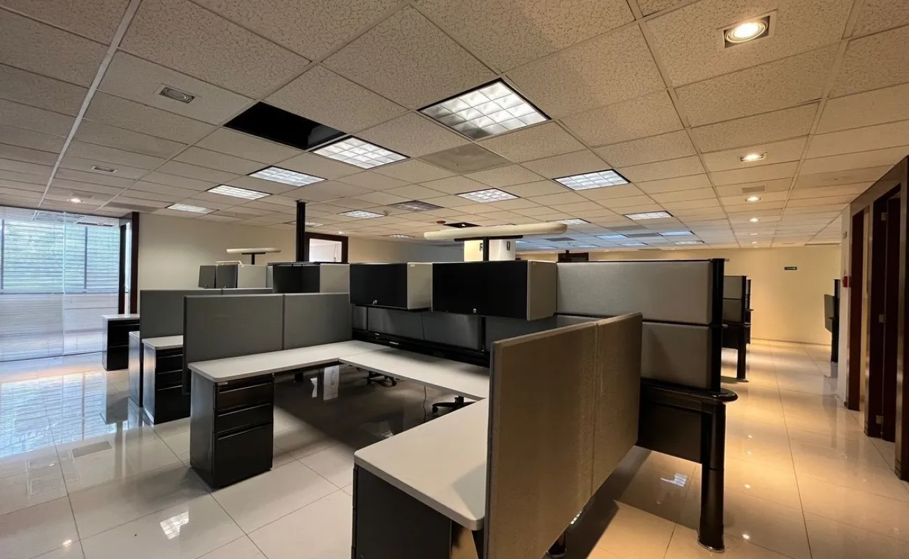 Pisos y techos con acabados, cableado y luminarias funcionando.