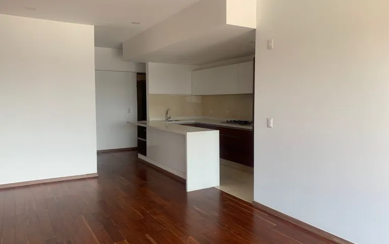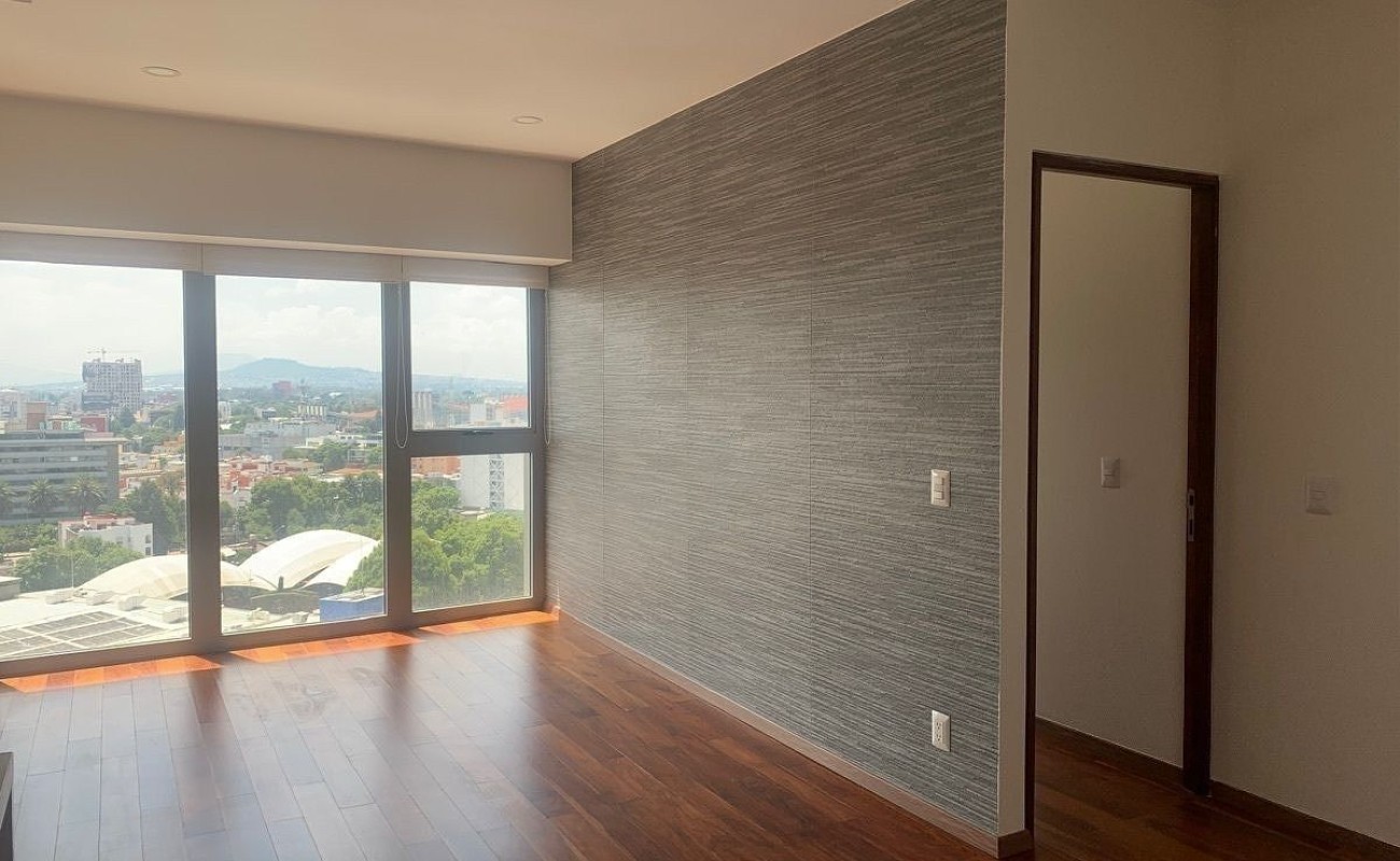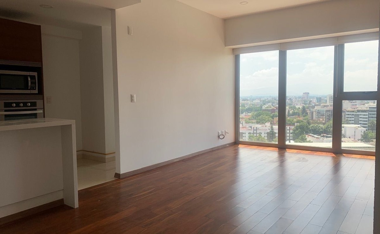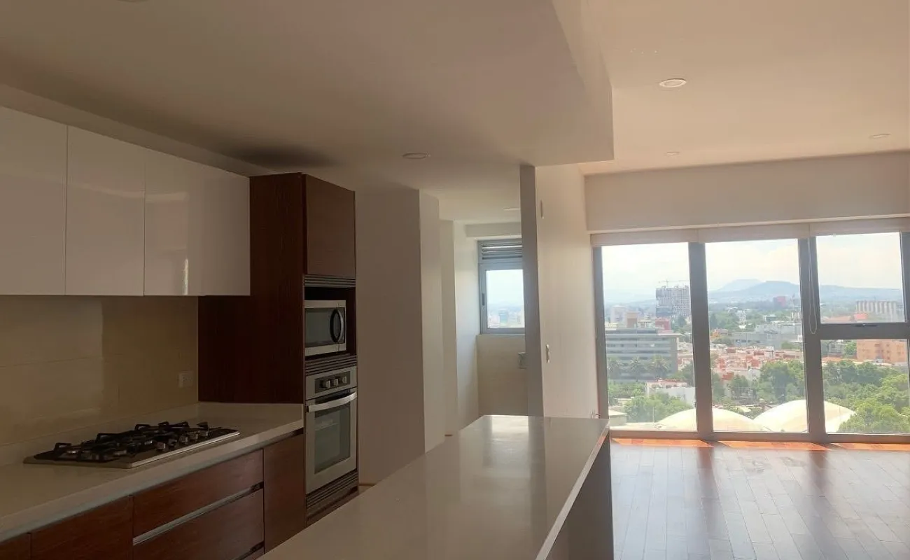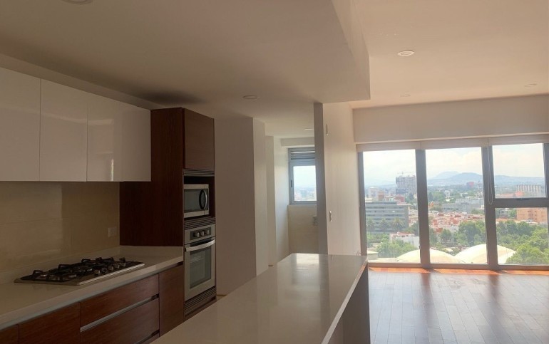 Estancia con gran ventanal y vista exterior hacia la avenida Mexico Coyoacan. Cocina equipada con barra y contiguo el área de lavado.