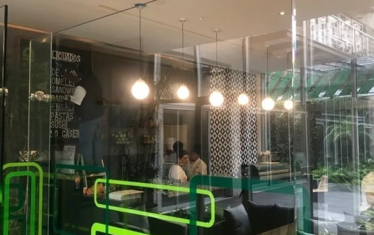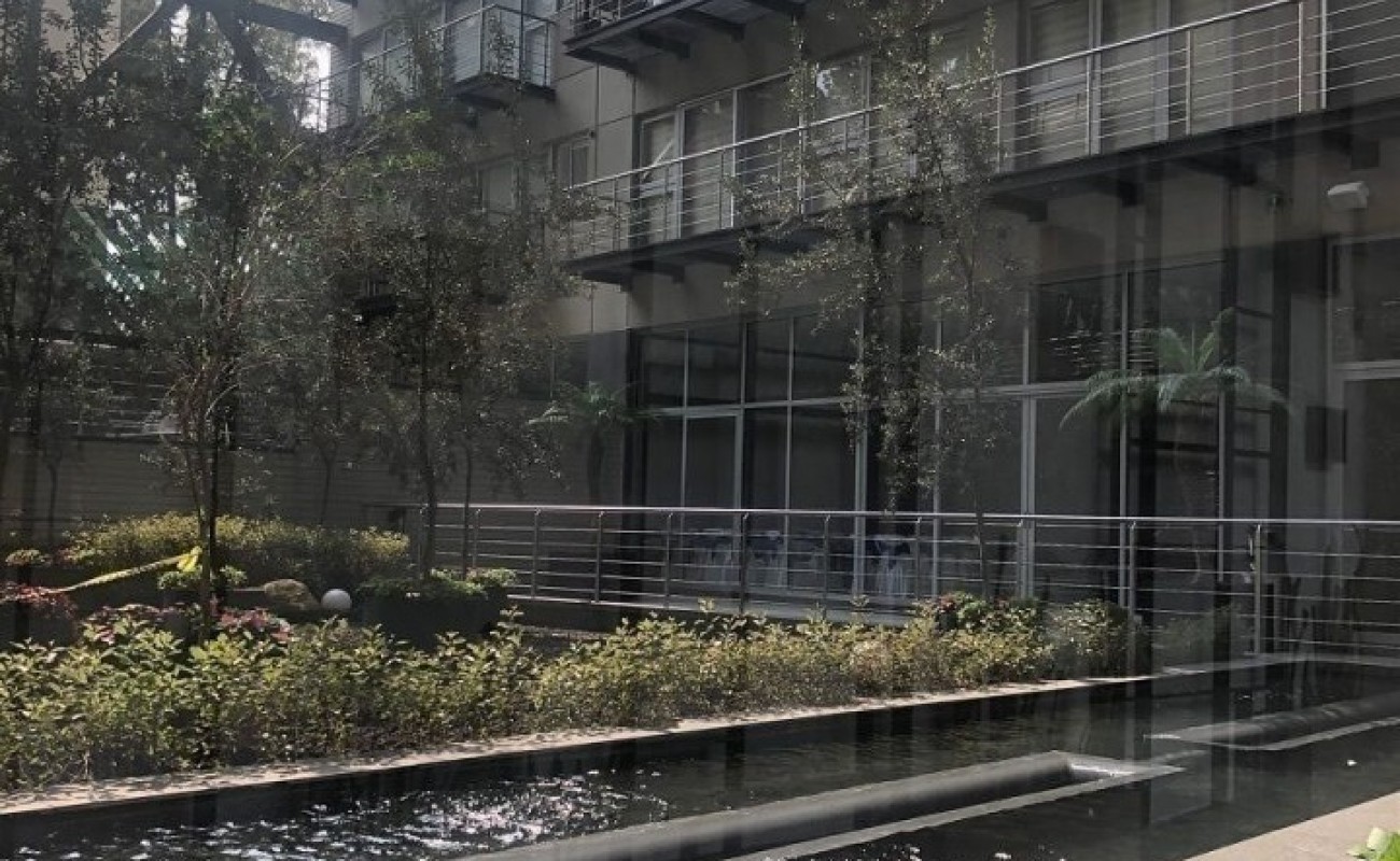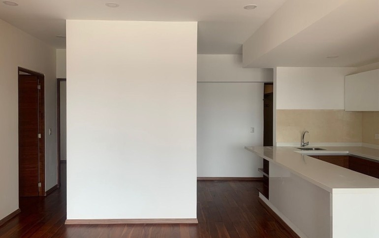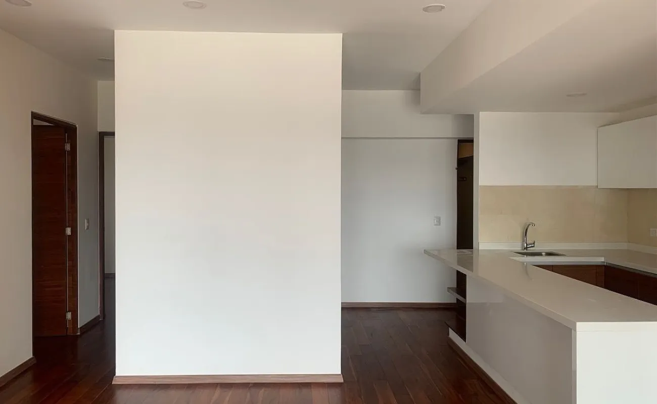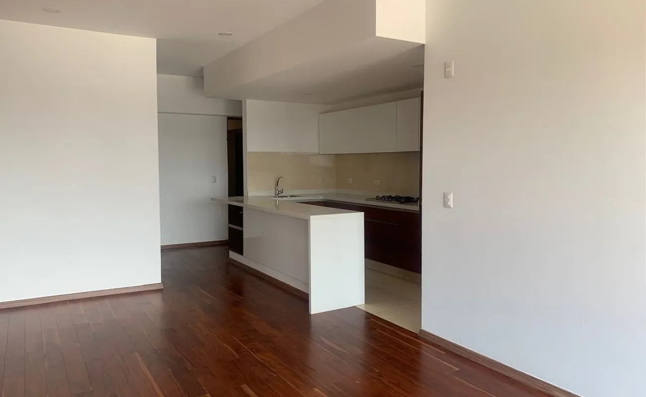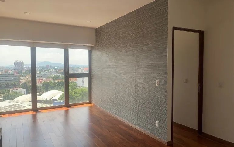 Estancia con gran ventanal y vista exterior hacia la avenida Mexico Coyoacan. Cocina equipada con barra y contiguo el área de lavado.