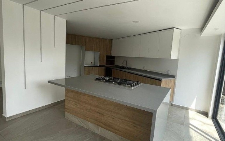 Cocina abierta de gran tamaño, ideal para la convivencia, con salida directa a una extraordinaria zona de carne asada, perfecta para reuniones al aire libre.