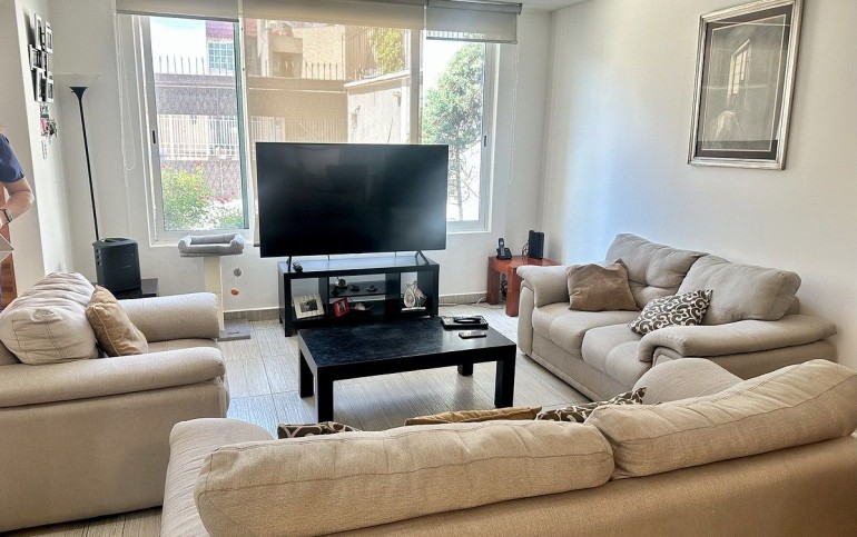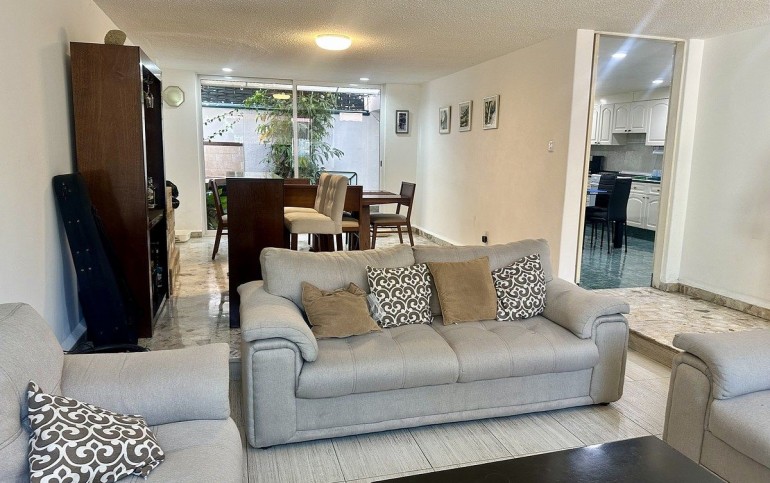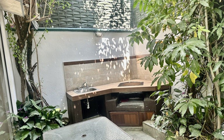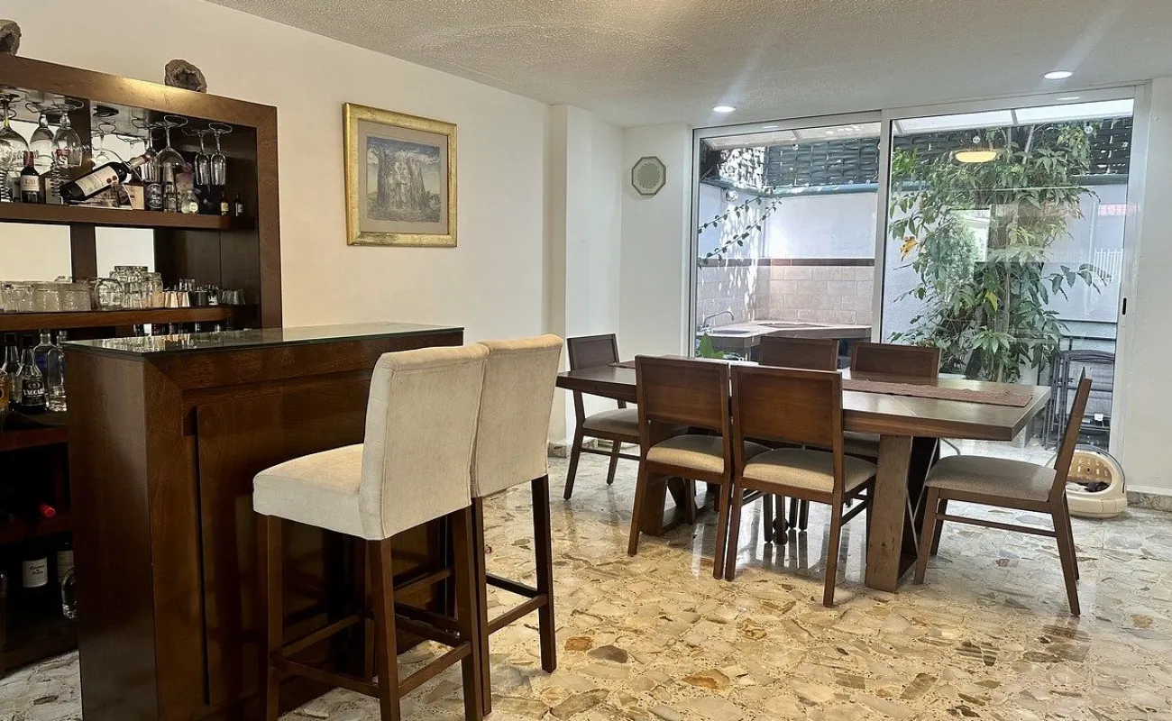 Estancia de sala y comedor, Cocina integral totalmente equipada,Patio interior arbolado con asador, Medio baño de visitas, Estudio, área de lavado (Con lavadora y secadora).