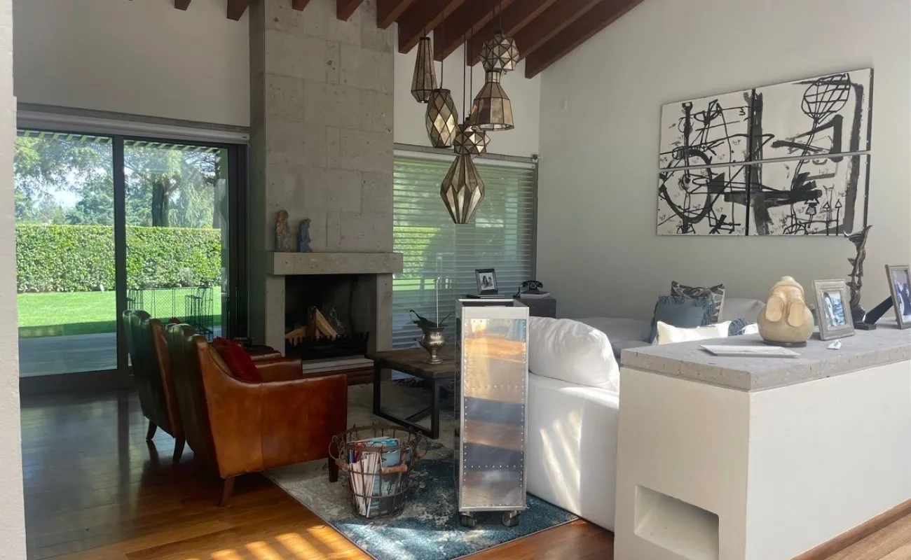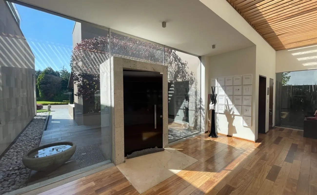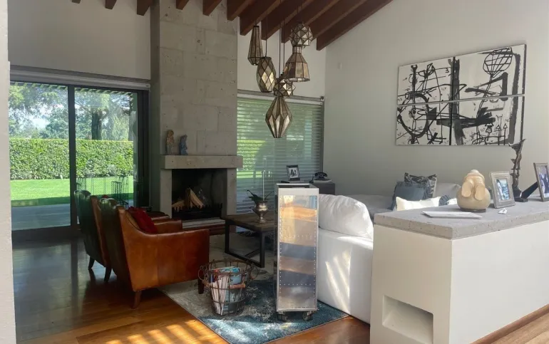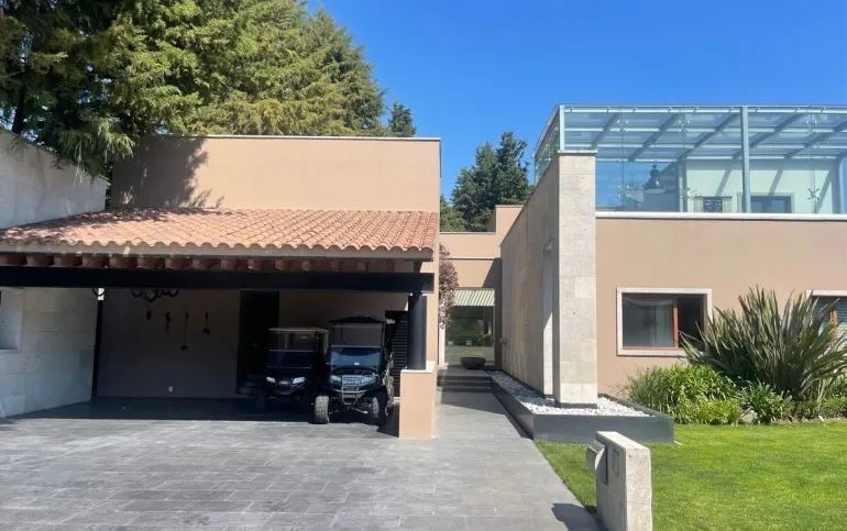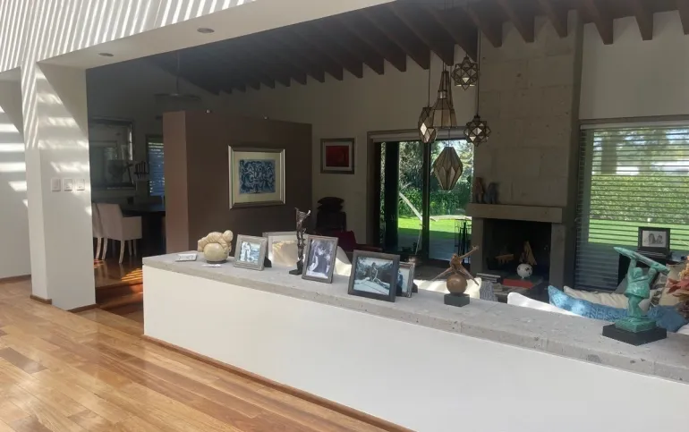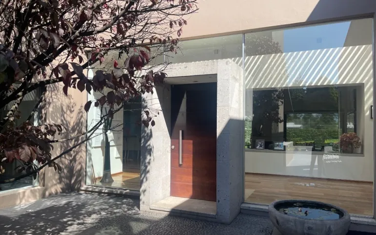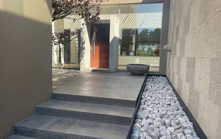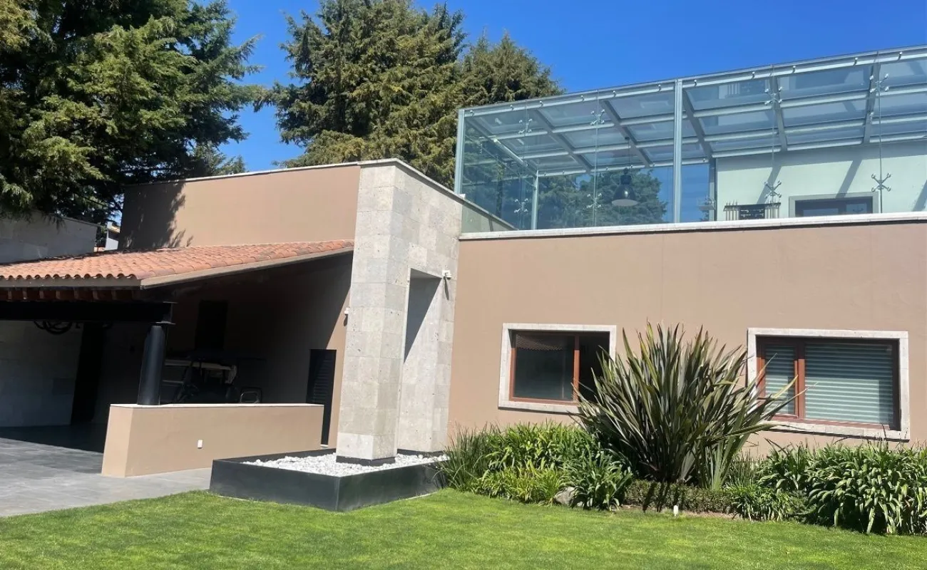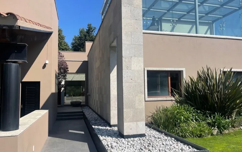 calefacción hidrónica, riego por aspersión, Jardín con pasto ingles, acabados en mármol y cantera, pisos de ingeniería, canceleria de importación, techos inclinados con vigas y tarimas de madera