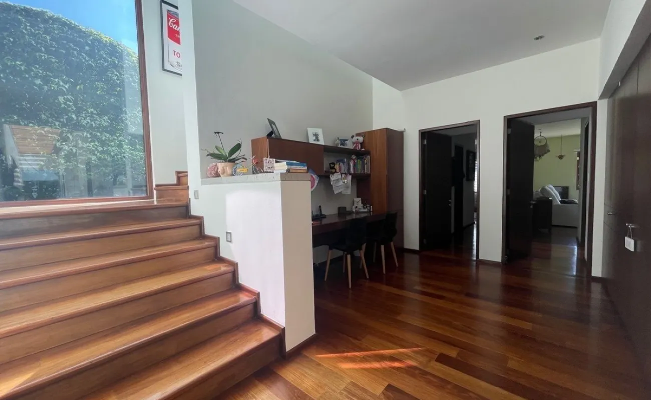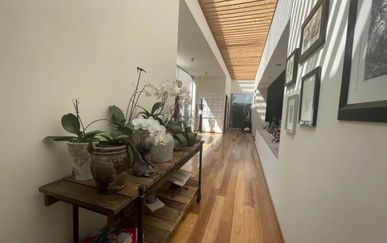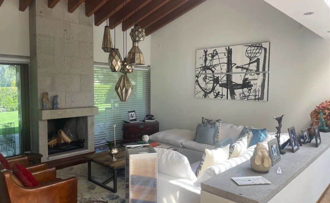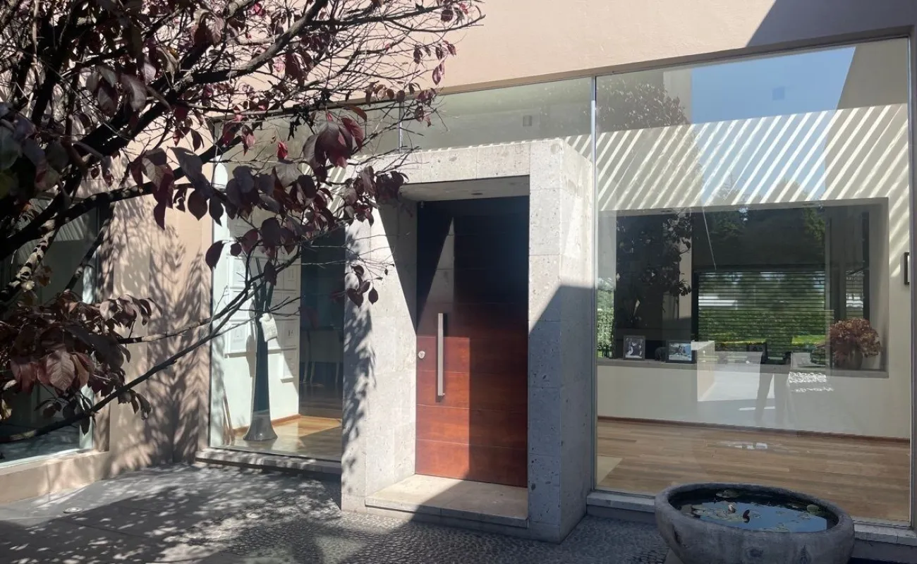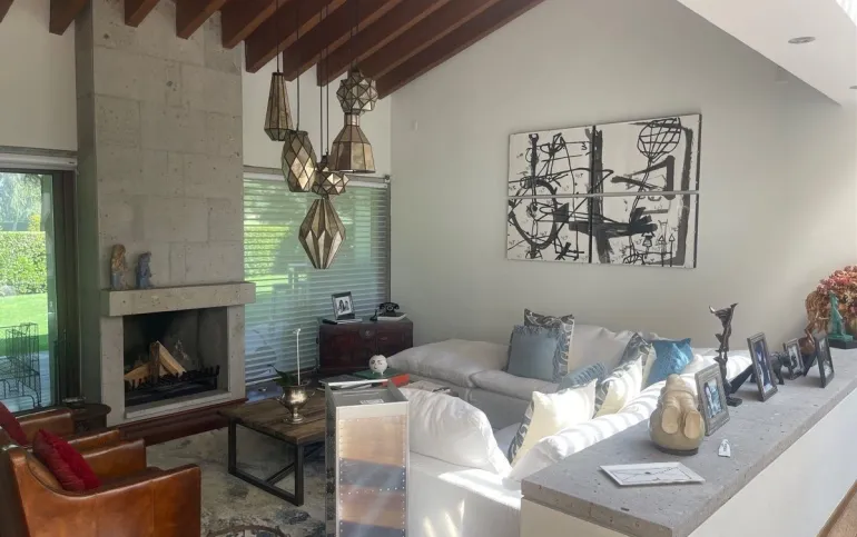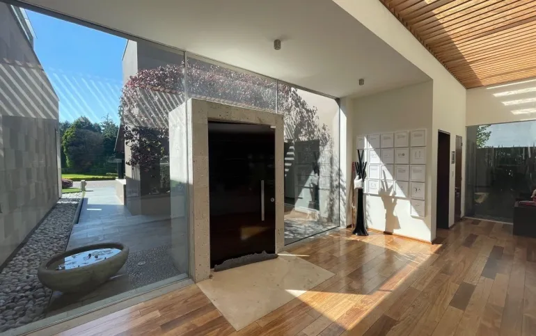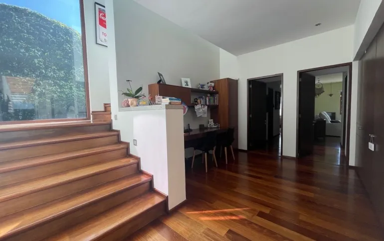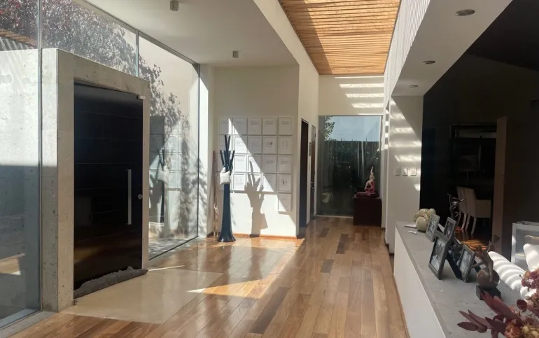 calefacción hidrónica, riego por aspersión, Jardín con pasto ingles, acabados en mármol y cantera, pisos de ingeniería, canceleria de importación, techos inclinados con vigas y tarimas de madera