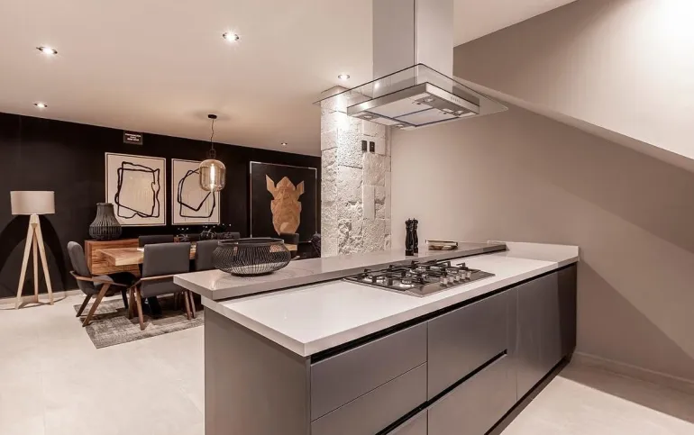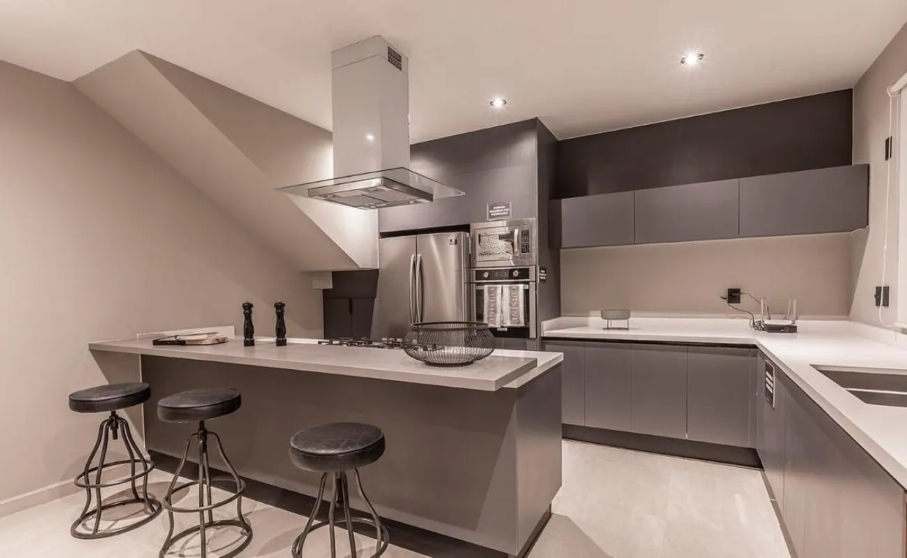 Cocina equipada con horno, estufa, campana y barra de granito