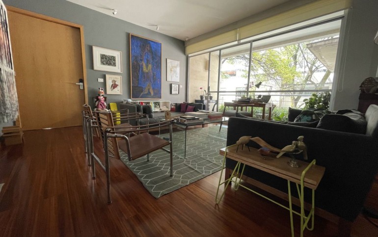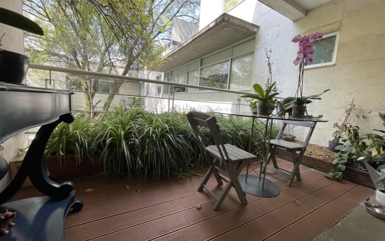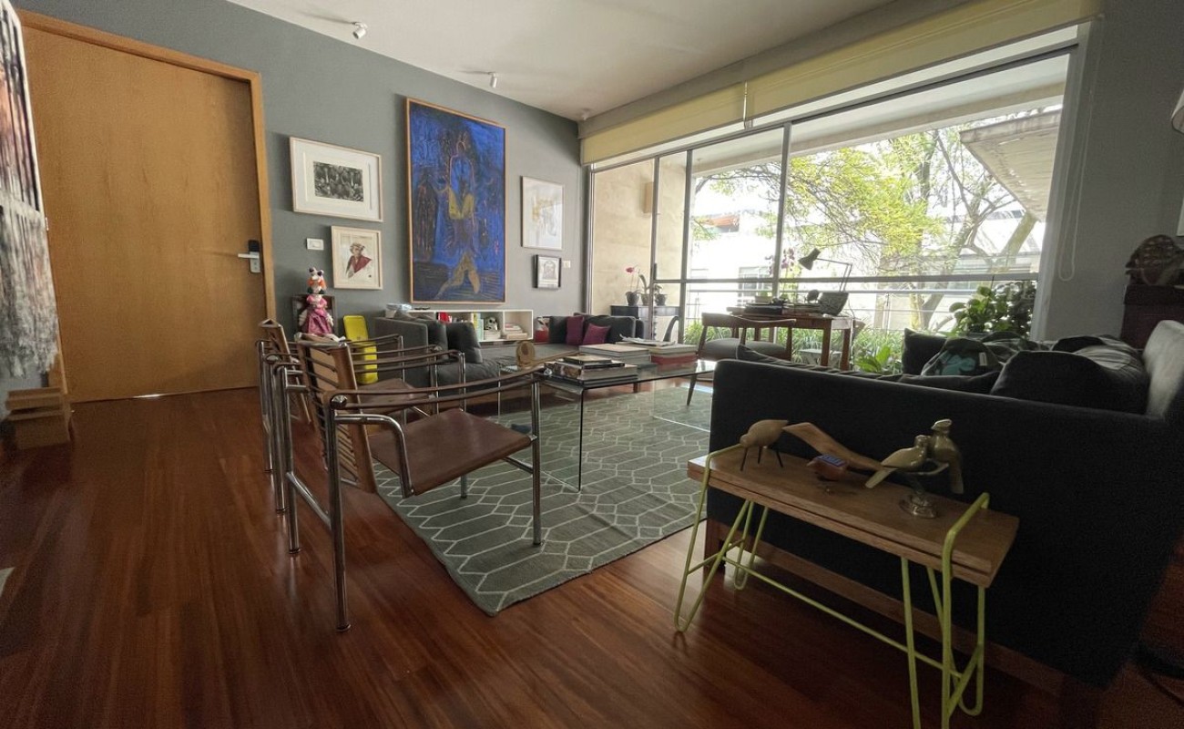 El proyecto integra la sala a una preciosa terraza con vista al jardín interno, creando un ambiente tranquilo y lleno de luz.
