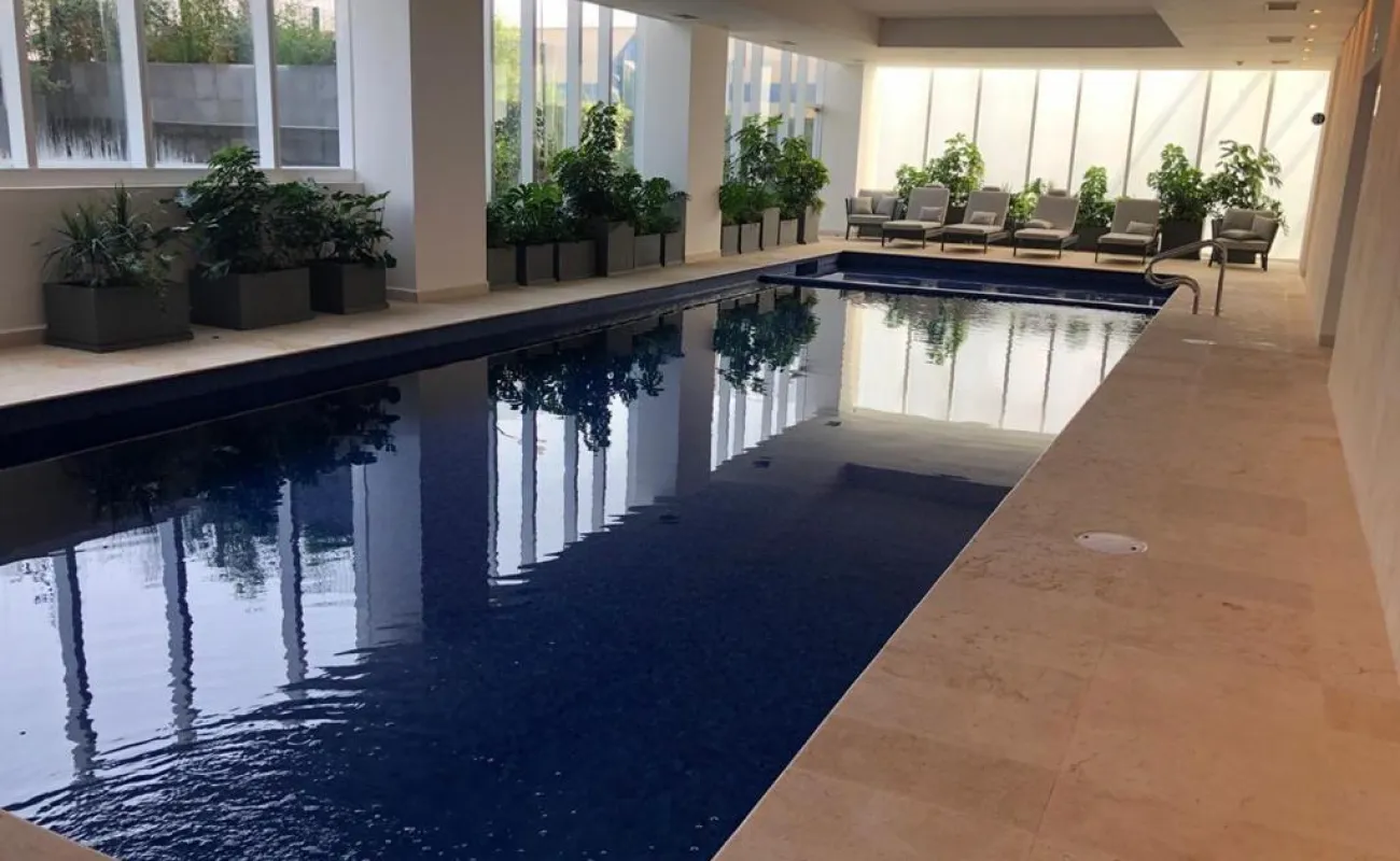 Recepción, alberca techada y terraza, gimnasio (con área de baños y regaderas), salón de fiestas, ludoteca, salón de usos