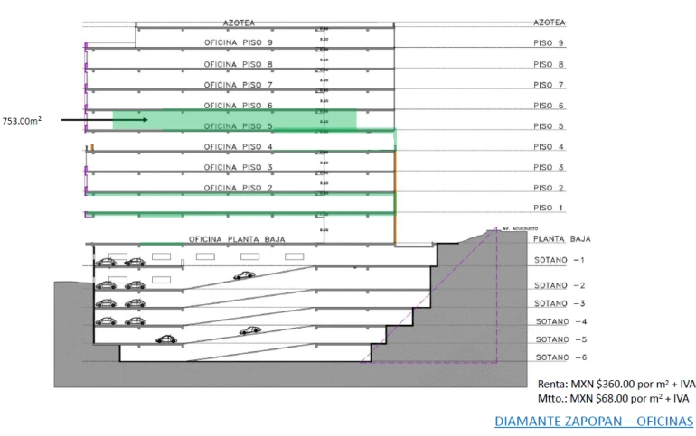 Se renta Oficina (en Obra Gris) en Edificio Dimante Zapopan, Jalisco, con un área de 753 mt2, en Piso 5.