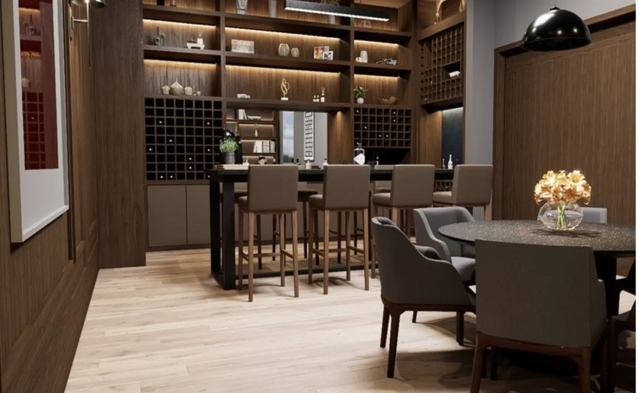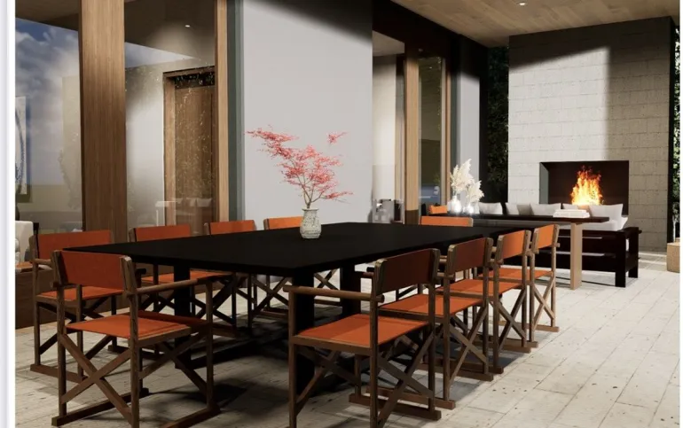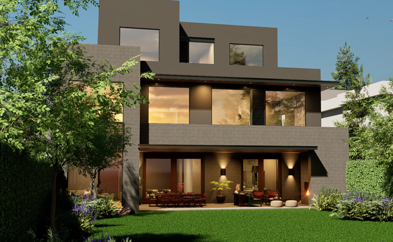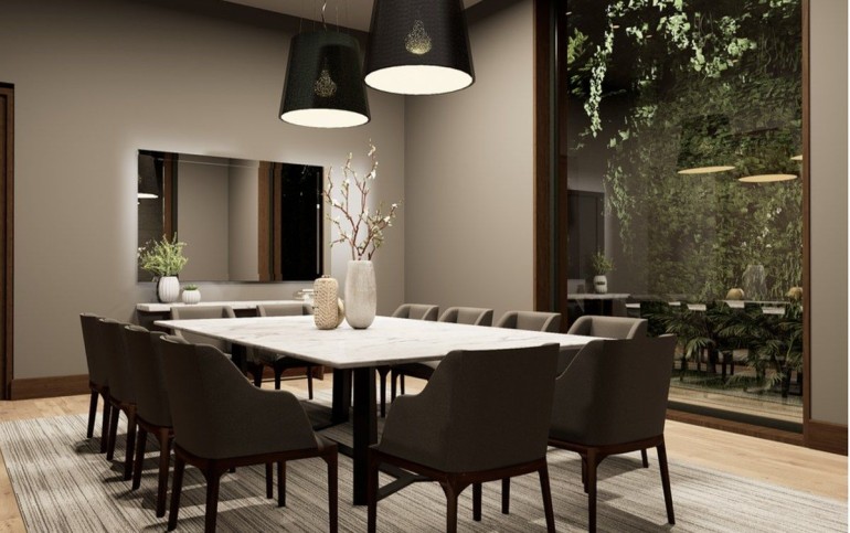 El acceso conduce a un vestíbulo con patio central de doble altura, que articula de forma natural las áreas sociales y privadas.