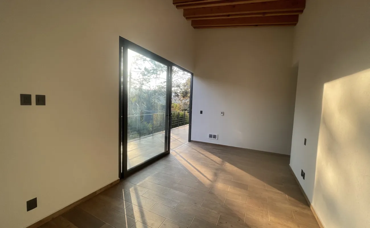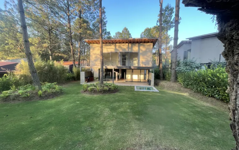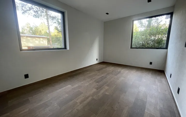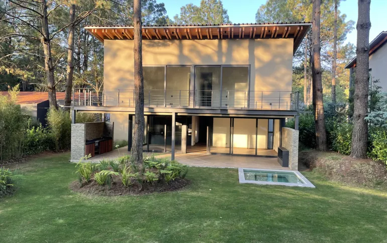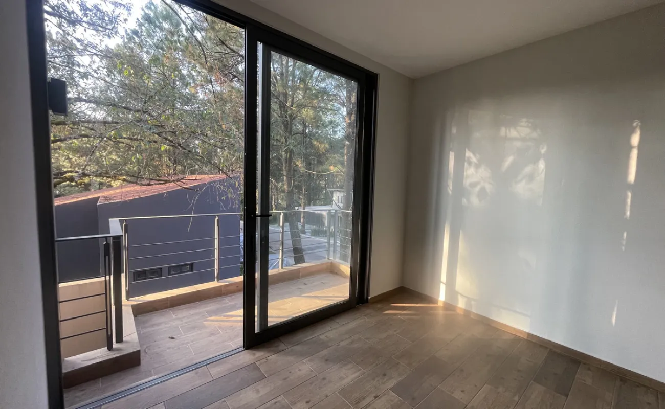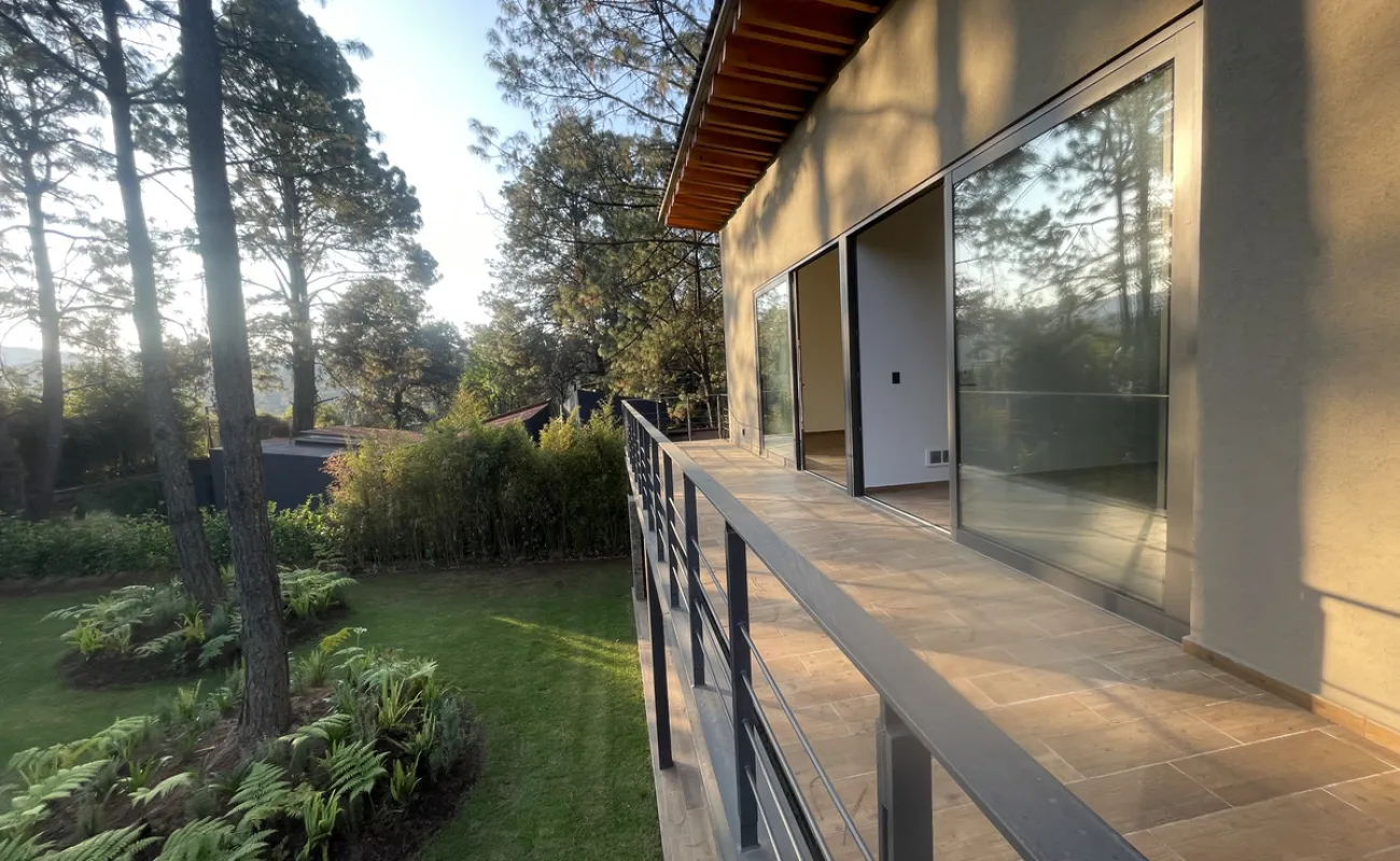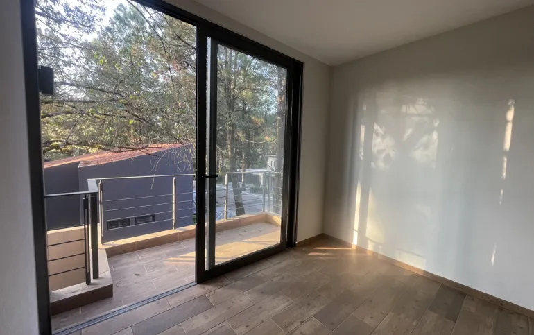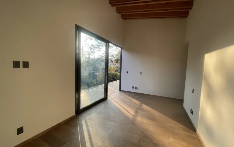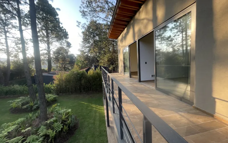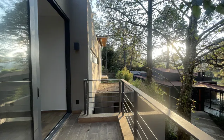 En planta alta 4 recamaras todas con baño y vestidor, techos con excelente altura y con vigas de madera. Dos de ellas con un balcón grande con vista al bosque, otra de ellas con terracita.
