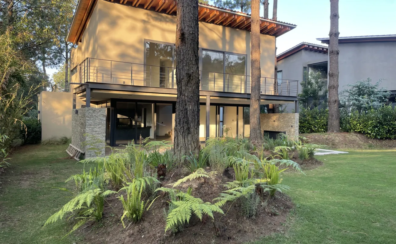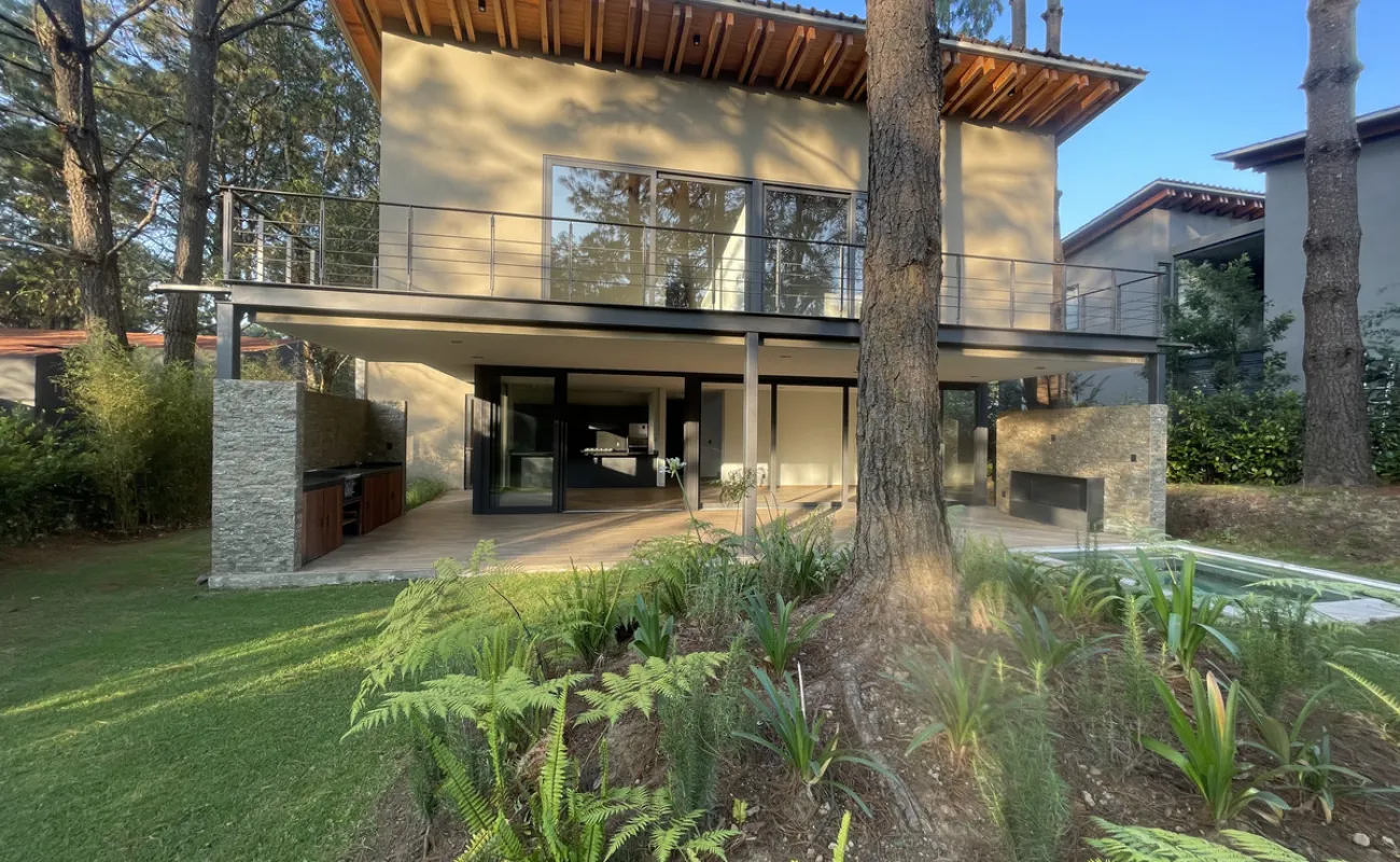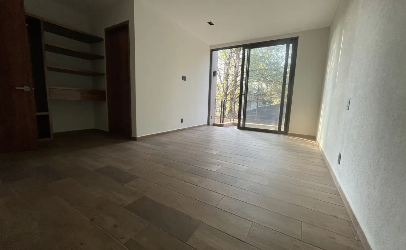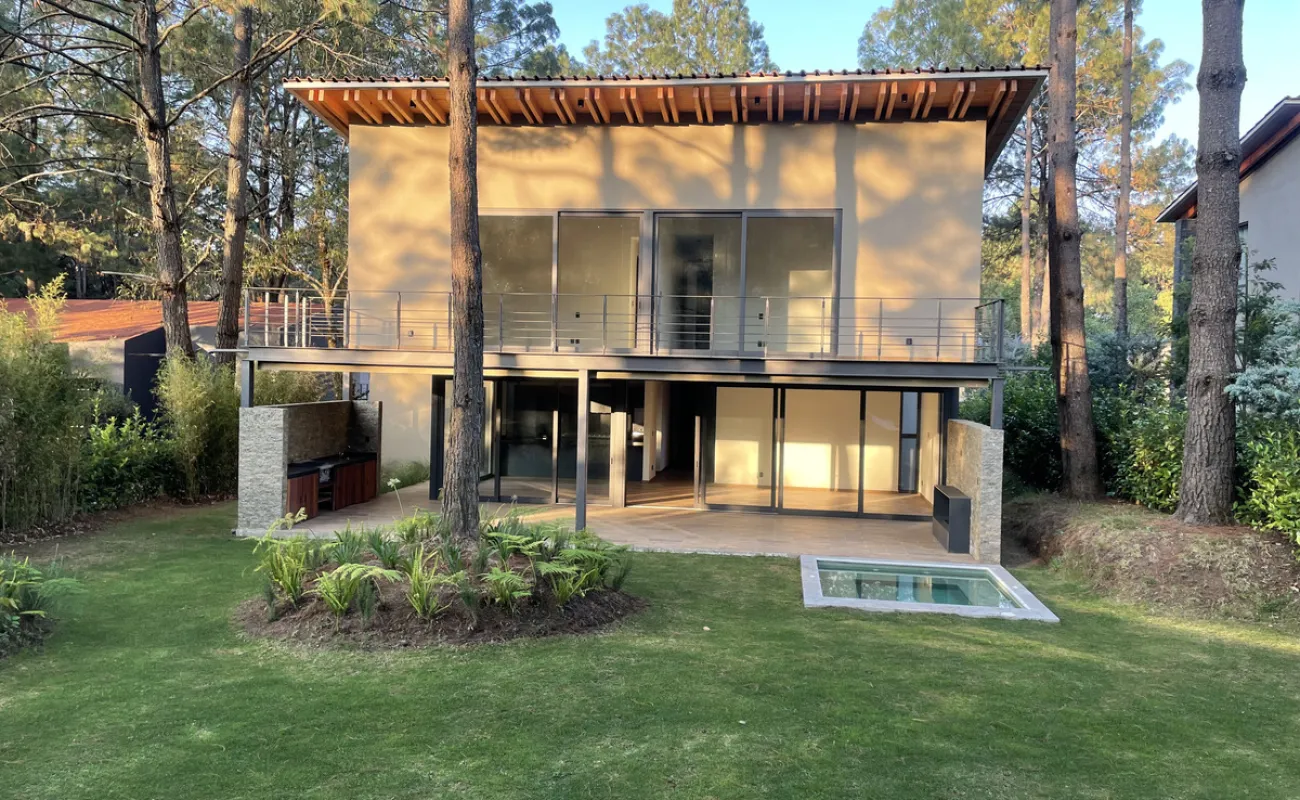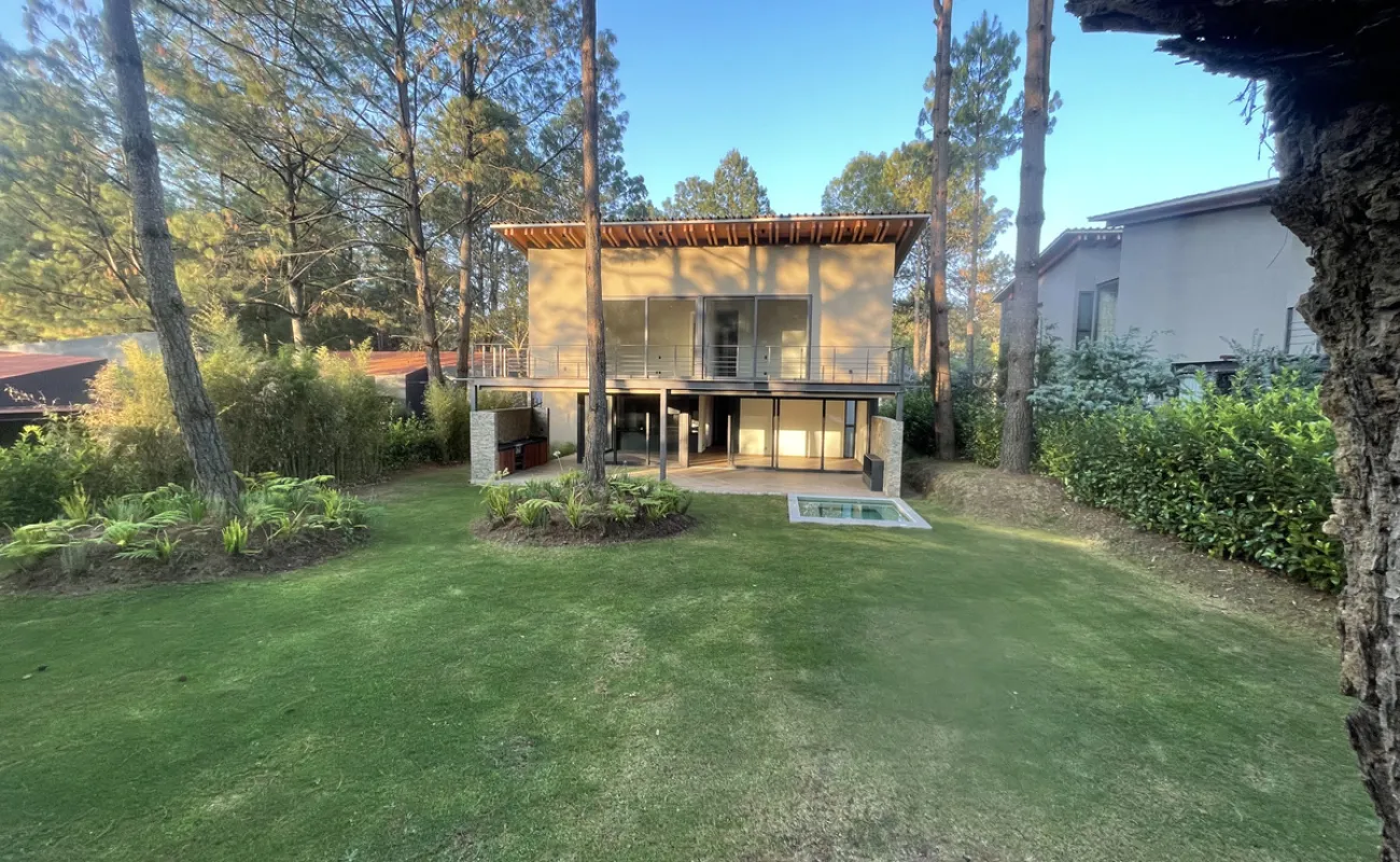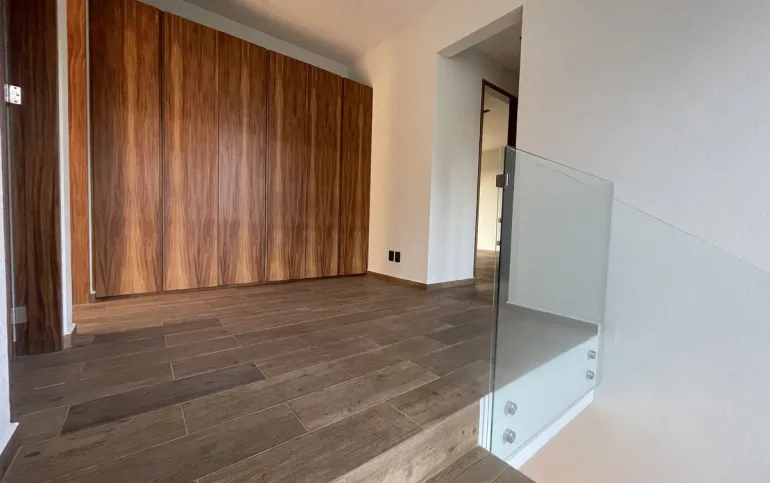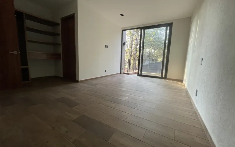 En planta alta 4 recamaras todas con baño y vestidor, techos con excelente altura y con vigas de madera. Dos de ellas con un balcón grande con vista al bosque, otra de ellas con terracita.